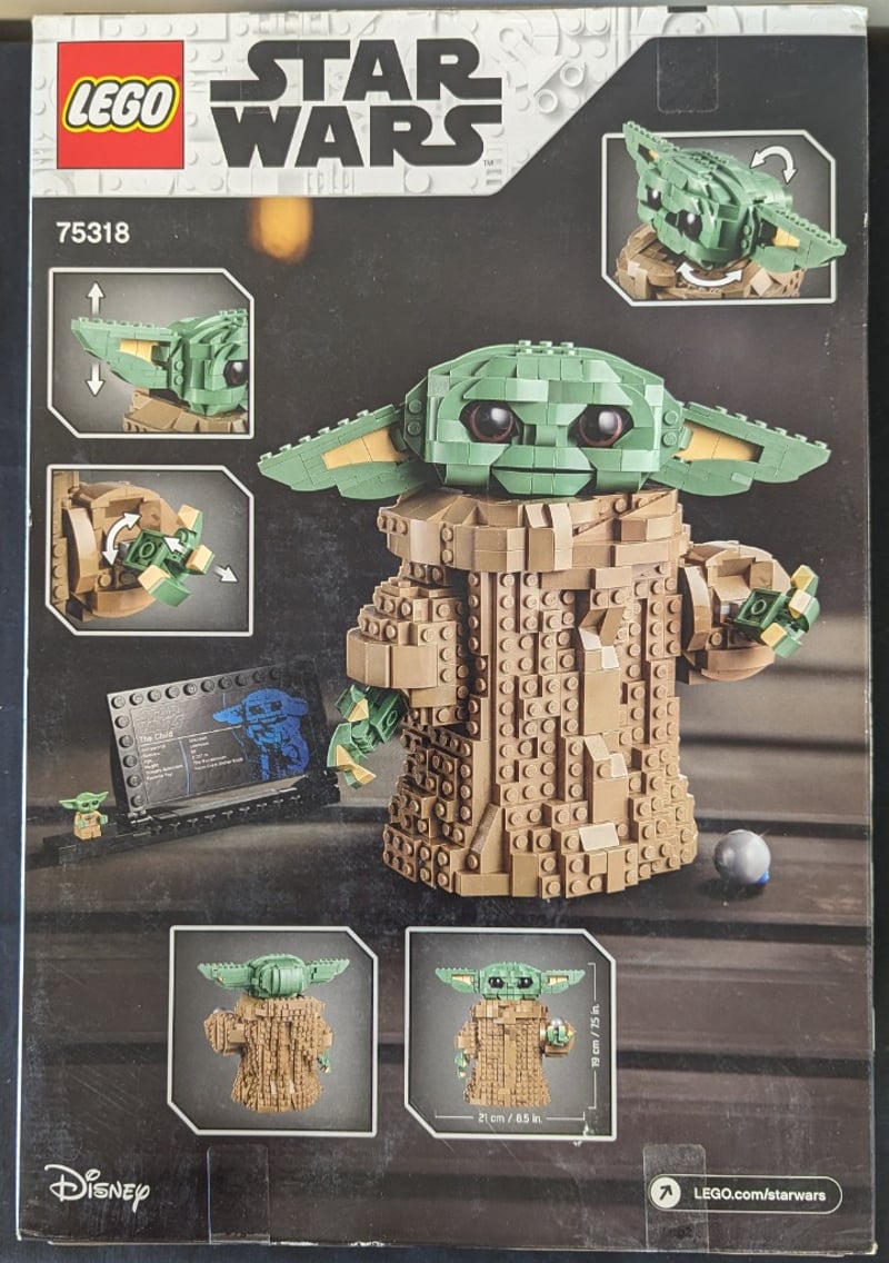 Lego Star Wars Set 75318 Featuring The Child (Grogu) From The Mandalorian Series. This 10+ Rated Construction Set Includes A Buildable Figure With Articulated Head, Ears, And Arms, Poseable Hands, And Expressive Eyes. The Set Comprises A Detailed Torso With Textured Robing And Fabric-Like Detailing, Movable Limbs, And An Included Minifigure Accessory