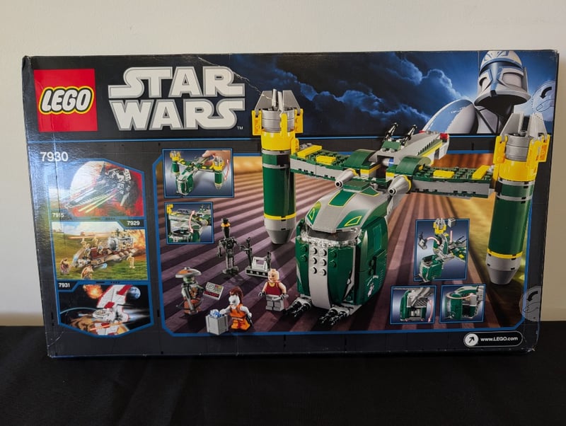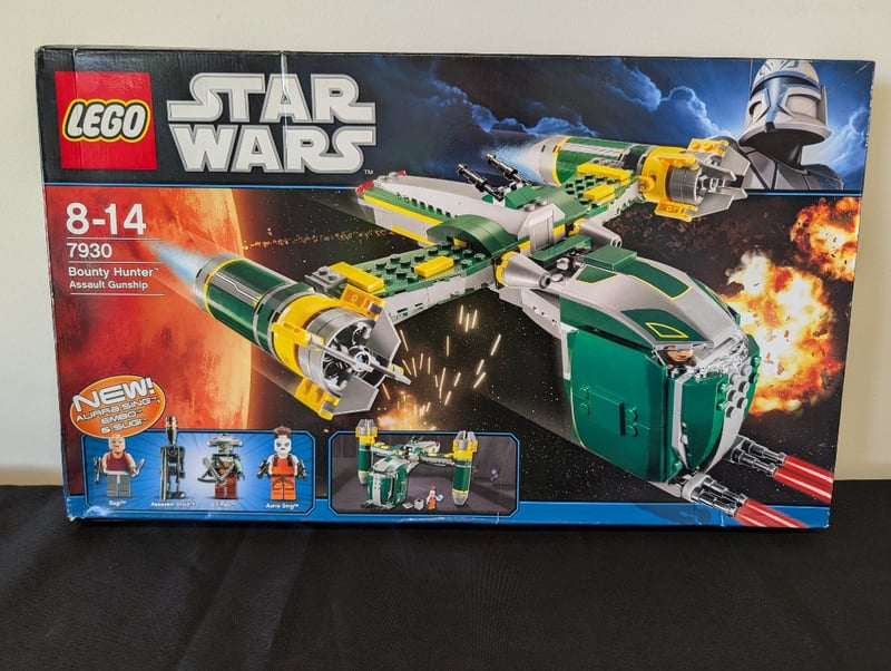 LEGO STAR WARS 7930 BOUNTY HUNTER ASSAULT GUNSHIP SETItem Size: Height: 28cm, Width: 55cm, Depth: 25cm, Weight: 2KgLego Star Wars Set 7930 Bounty Hunter Assault Gunship Featuring Green And White Spacecraft With Yellow Detailing, Includes Minifigures, Original Box With Printed Graphics Showing Clone Trooper And Action Scenes, Age Recommendation 8-14 Years, Complete With Construction Elements And Assembly Instructions.Condition: Fair - Refer To Images584518+59