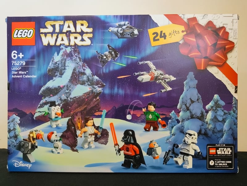 Lego Star Wars Advent Calendar Set 75279 Featuring 24 Daily Gift Surprises. Includes Multiple Minifigures (Luke Skywalker, Darth Vader, Stormtrooper, And Others), Micro-Scale Starships (X-Wing, Tie Fighter, Millennium Falcon Variants), And Themed Accessories. Snow-Covered Tatooine Landscape Setting With Ice-Laden Rock Formations And Pine Trees. Original Packaging With Red Ribbon Bow. Age Recommendation 6+. Includes Access Code For Lego Star