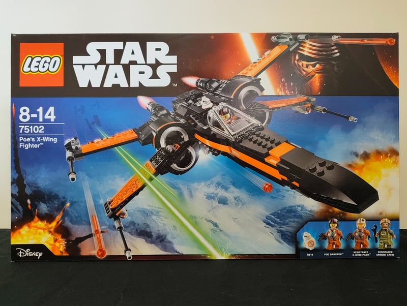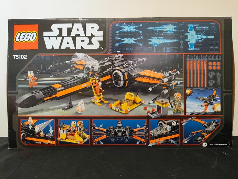 LEGO STAR WARS POE'S X-WING FIGHTER SET 75102Item Size: Height: 40cm, Width: 55cm, Depth: 10cm, Weight: 5KgLego Star Wars Set 75102 Featuring Poe Dameron'S Iconic Orange And Black X-Wing Fighter From The Force Awakens. Includes Detailed Minifigures (Poe Dameron, Resistance Pilot, Bb-8 Droid, And Resistance Soldier) And Comprehensive Building Components With Motorized Functions And Rotating Wings. Box Displays Construction Schematics, Multiple Play Configurations, And Accessory Details. Ages 8-14.Condition: Good - Refer To Images584518+186