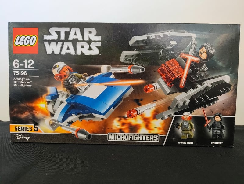 Lego Star Wars Set 75196 Featuring A-Wing Pilot And Kylo Ren Minifigures With Dual Microfighter Spacecraft. Includes Blue And White A-Wing Starfighter And Black Tie Silencer With Red Accents. Series 5 Release With Original Packaging Showing Both Front And Side Box Art Displaying Action Scenes And Minifigure Details.