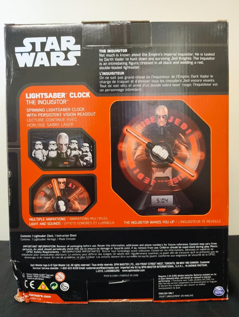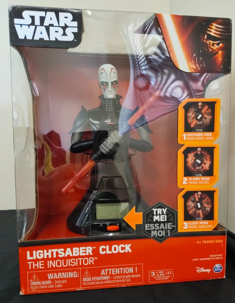 STAR WARS LIGHTSABER CLOCK - THE INQUISITORItem Size: Height: 30cm, Width: 20cm, Depth: 15cm, Weight: 3KgLicensed Star Wars Lightsaber Clock Featuring The Inquisitor Character With Spinning Red Lightsaber Blade And Persistent Vision Readout Display. Features Three InteractiveCondition: Good - Refer To Images584518+173