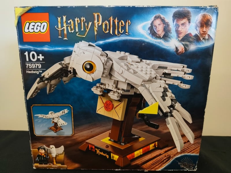 LEGO HARRY POTTER HEDWIG SET 75979Item Size: Height: 35.4cm, Width: 30cm, Depth: 12cm, Weight: 3KgLego Harry Potter Hedwig Set 75979 Featuring A Detailed White Owl Minifigure Construction With Articulated Wings, Golden Eyes, And Perched On A Brown Wooden Display Stand With Hogwarts Crest Emblem. Includes Harry Potter Minifigure. Original Blue Box With Character Imagery And Construction Details Visible.Condition: Fair - Refer To Images584518+41