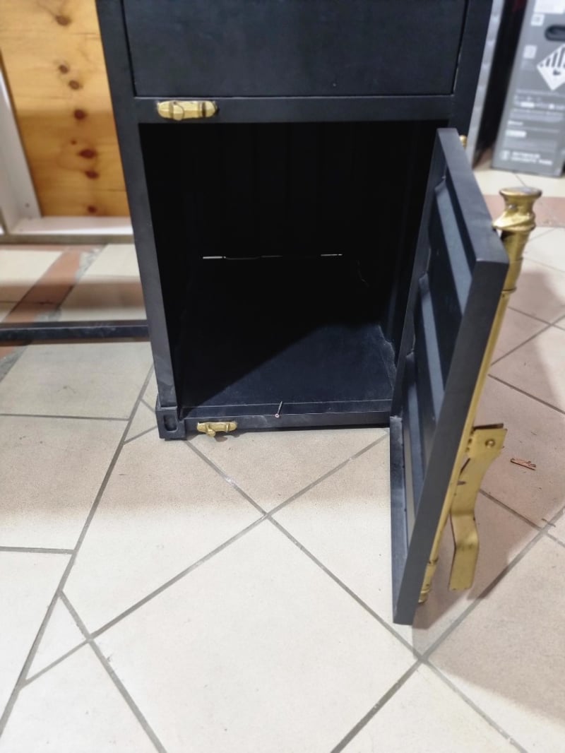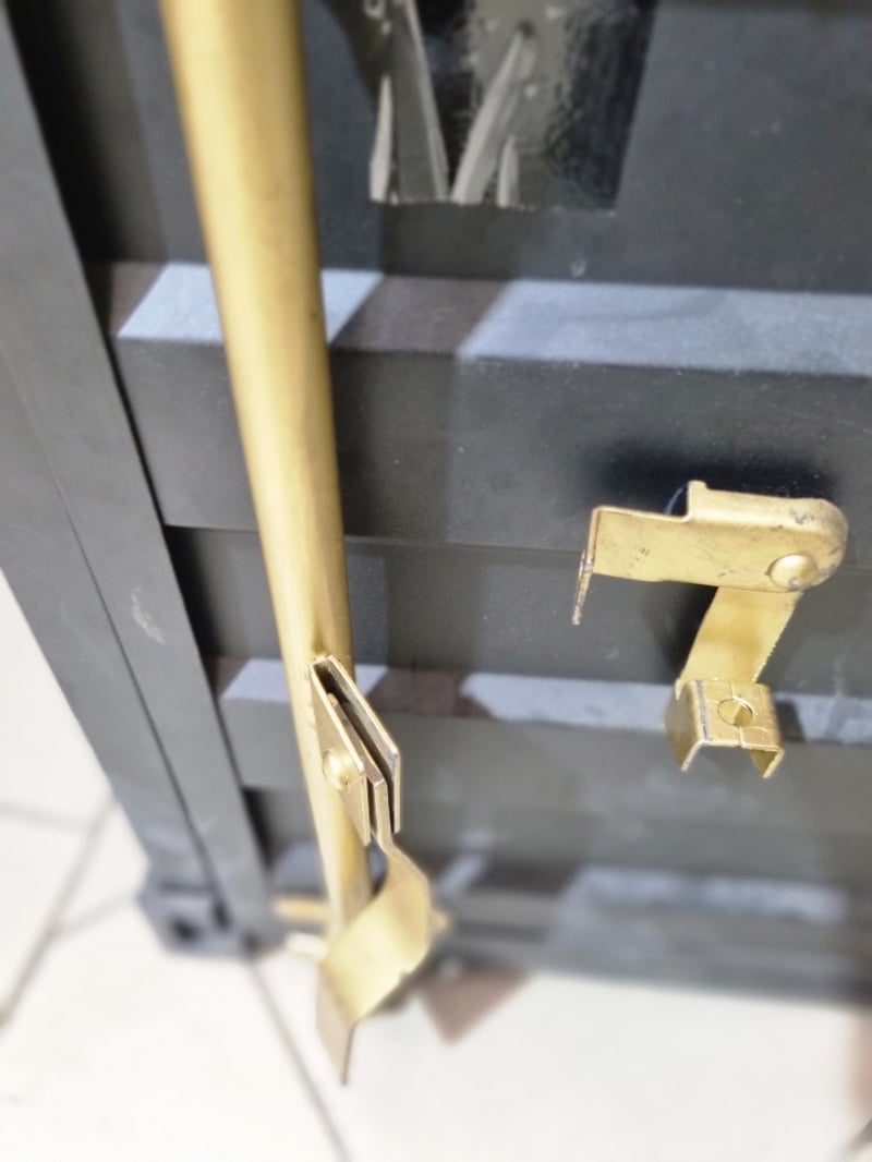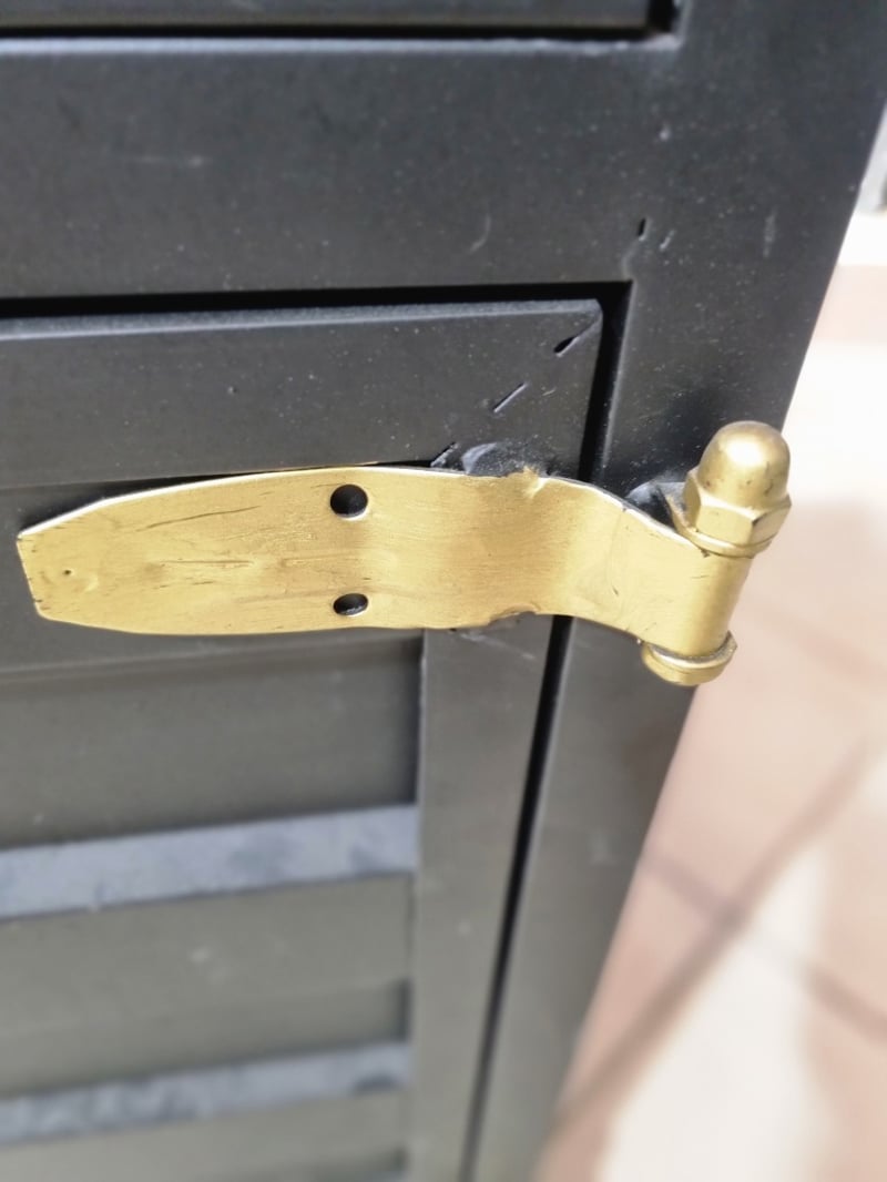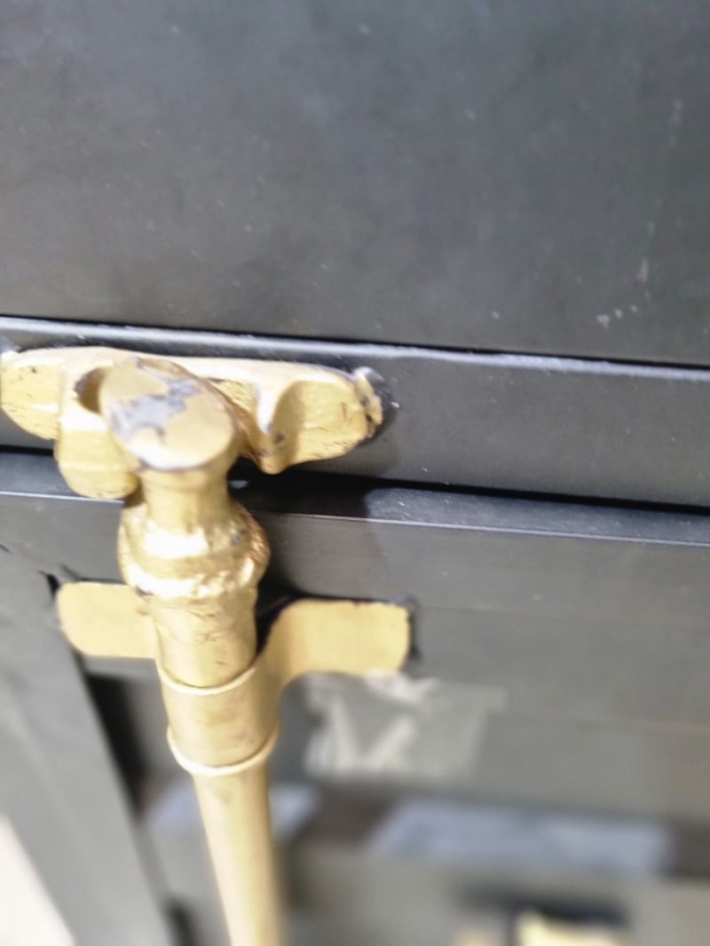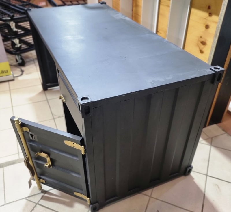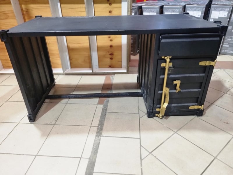 Industrial desk, black leather, bronze like latches. Note: signs of wear