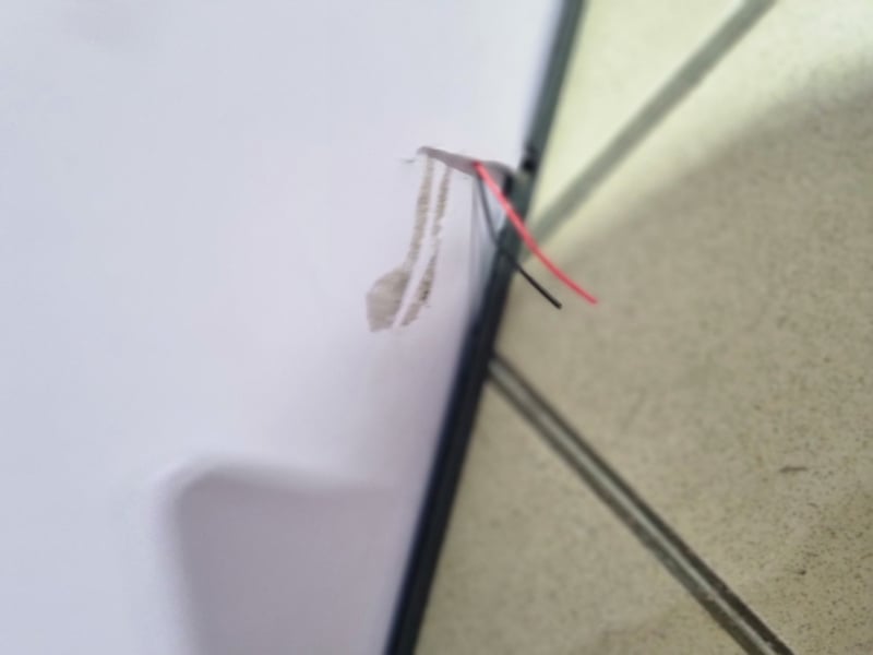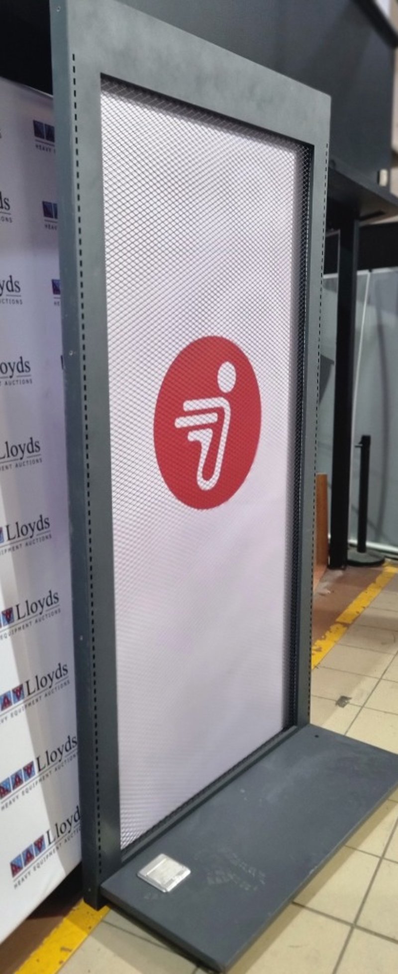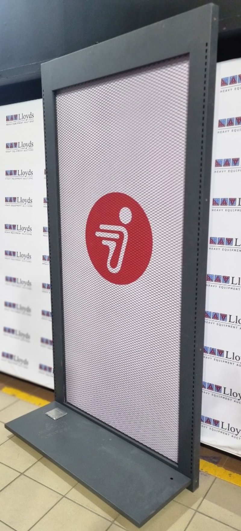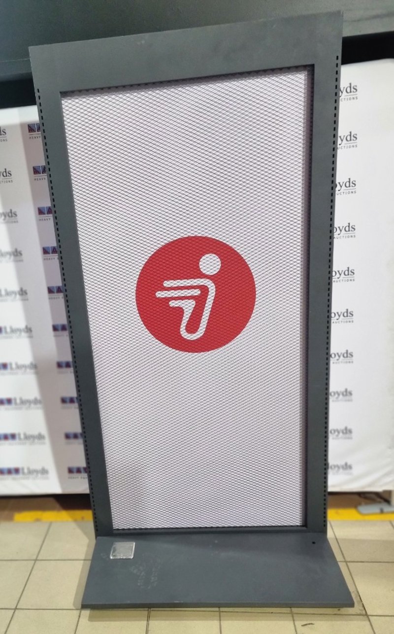 Freestanding display stand featuring red circular branding with logo. Metal frame construction with grey powder-coated finish and stable base. Mesh panel front allows visibility while maintaining structure. Includes integrated electrical components with visible wiring and Gaskell control unit mounted on base. Note: untested,signs of wear