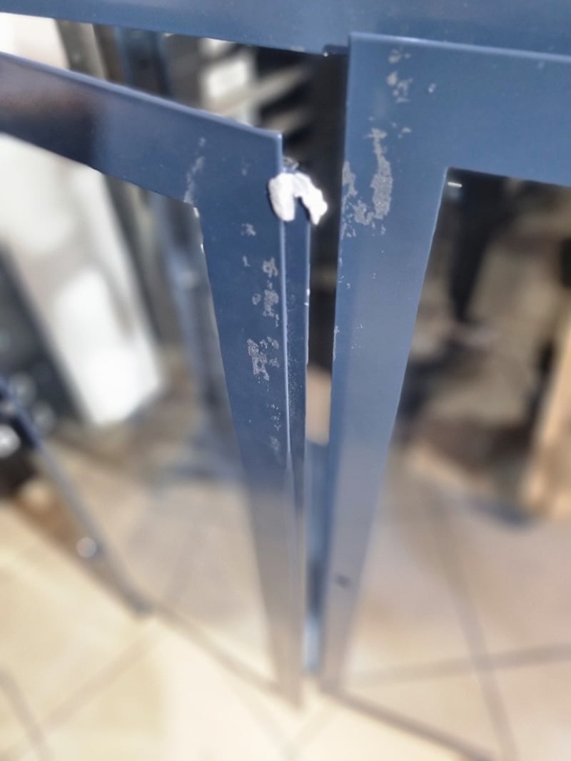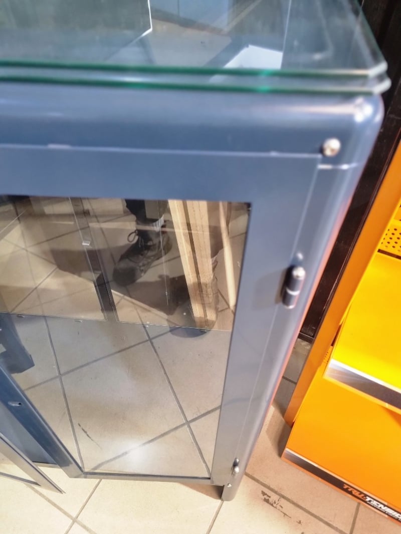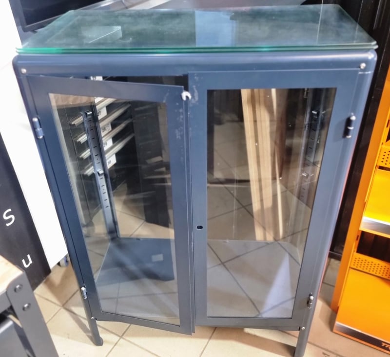 Industrial storage drawers, black wood top, glass cabinet, navy metal frame glass shelving. Sold as lot Note: untested