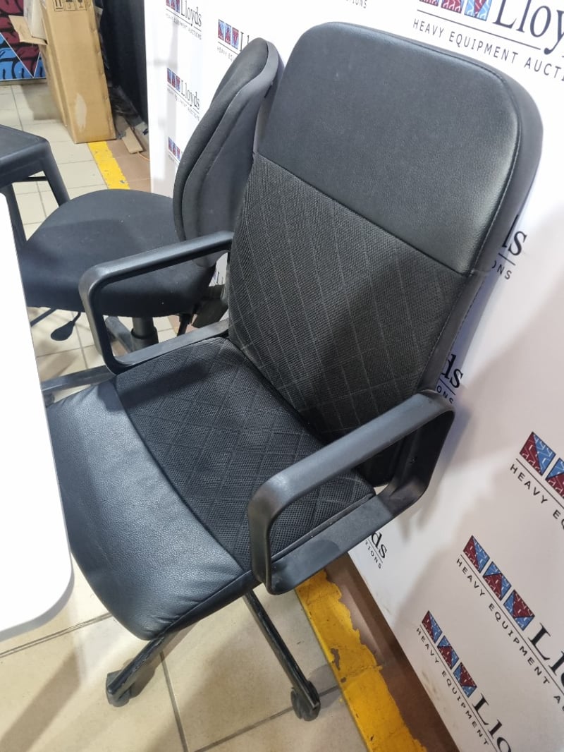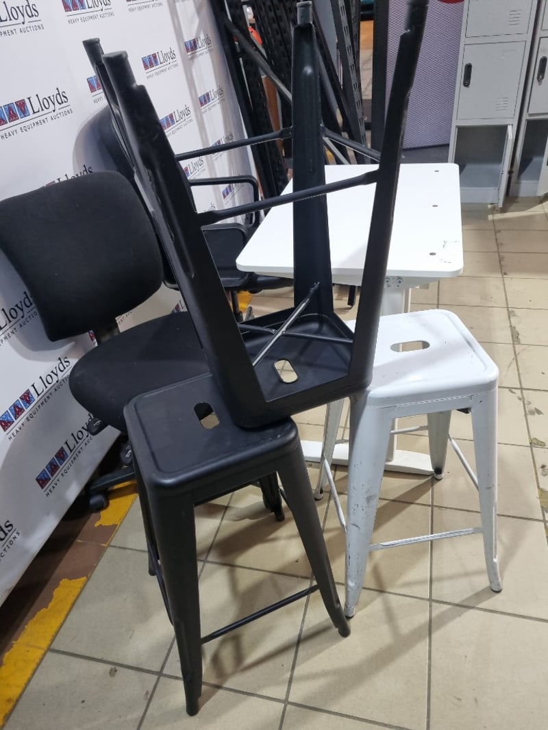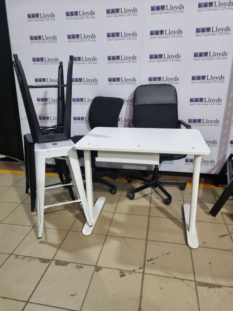 Office furniture,includes 3 x metal stools, 2 x office chaor and desk with metal frame Sold as lot Note: signs of wear