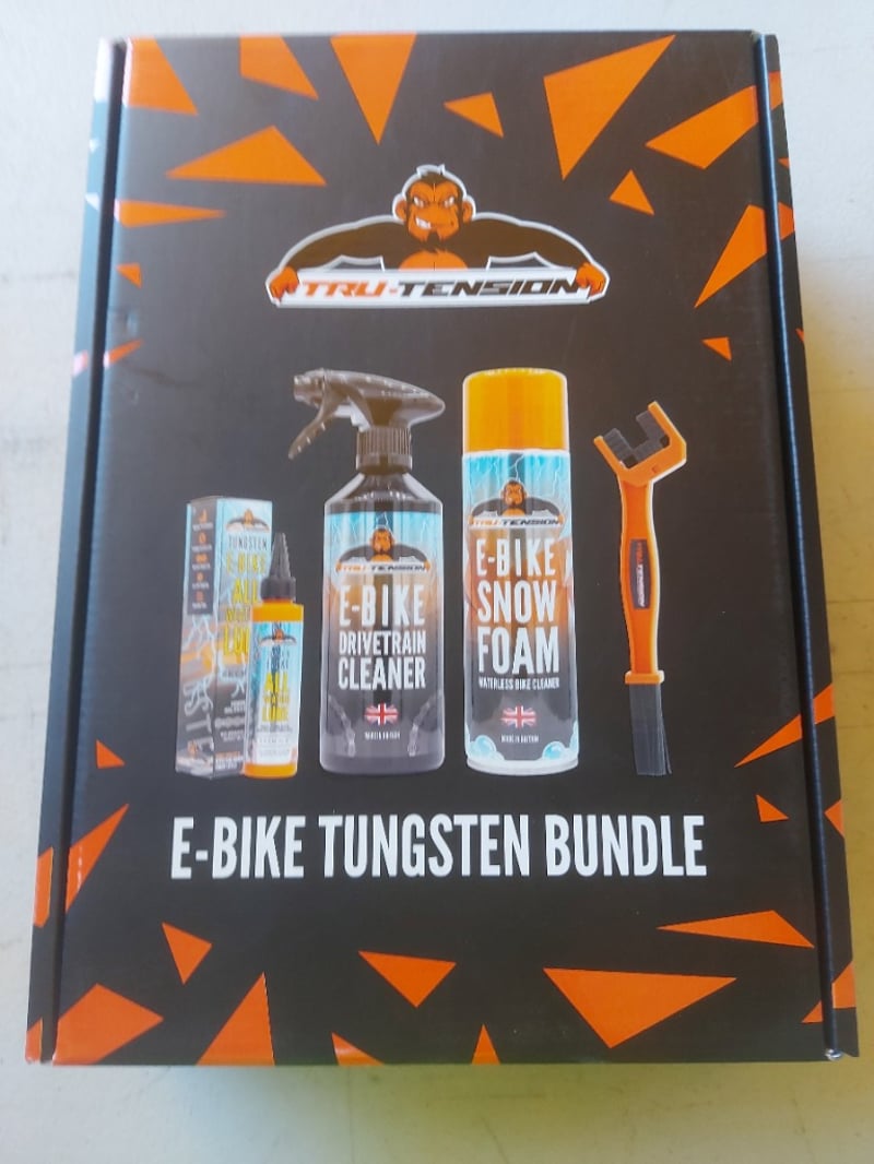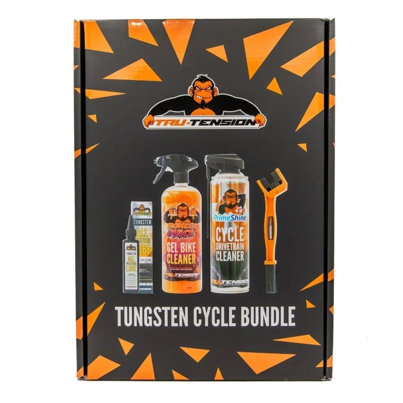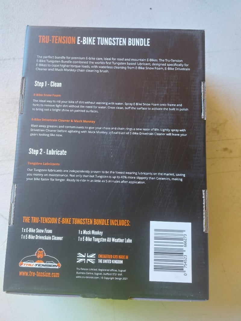 RRP $70 Tru-Tension E-Bike Tungsten Bundle A brilliant premium cleaning and lubricating bundle for any e-road bike or e-mountain bike. Our Tungsten lubricant is proven to significantly reduce the wear on drivetrains compared to any other drip lubricants on the market. Upgrade any cycling toolbox with this premium 4 piece Tungsten Bundle. Perfect for any rider from seasoned riders to new cyclists and racers alike. Combining the world first and patent-pending Tungsten lubricants with state of the art cleaning products provide every biker with the perfect platform to clean, protect and lubricate your bike. Designed applications specifically for E-Bikes. Contains 1 x E-Bike Snow Foam 1 x Muck Monkey Chain Brush 1 x E-Bike Tungsten All Weather Chain Lubricant 1 x E-Bike Drivetrain Cleaner Revolutionary cycle technology to clean, protect and effectively lubricate any road or mountain E-Bike. E-Bike Snow Foam is a revolution in cleaning. Even the quickest ride can lead to a full bike wash, but not anymore! Spray the Snow Foam onto the dirty areas and wipe away any grime, no water is required after short rides. For a deep clean simply spray and rinse with water before buffing. Perfect for cleaning in small spaces like a garage or shed. With built-in polish, it leaves a dirt-repellent finish with a shimmering shine. Drivetrain Cleaner instantly blasts away contaminants on the chain and chainrings to effectively eliminate grease and grime. It also protects using our in-house designed moisture-repellent formulation and rust inhibitors to keep moving components in optimum working condition. The Tru-Tension E-Bike Tungsten lubricants are the world's first cycle lubricants of their kind. Revolutionising lubrication in the cycling industry through faster, harder-wearing lubrication for any weather. Up to 40% faster than standard Ceramic and Teflon-based lubricants, our lubricants are the perfect selection for riders looking for a smoother ride and improved efficiency. Don't just take our word for it, check out the endurance data below provided by world-renowned and fully independent test facility Zero Friction Cycling in Australia. Tungsten All Weather Lube (the base for the E-Bike variant) is the only standard drip application lubricant to ever make it past 5,000km of extreme contamination testing without exceeding wear tolerance. Monkey Juice Concentrate Sachet has been designed to reduce the use of plastics and save money for every rider. Rather than buying a new bottle every time you've run out of cleaner, simply fill your Monkey Juice bottle to the refill line (800ml), pour in the concentrate and shake. Boom, you've got a second bottle of the innovative gel cleaner! How to use your E-Bike Tungsten Bundle Step 1: Spray bike with Monkey Juice and rinse away grime. Step 2: Blast away dirt on your drivetrain with Drivetrain Cleaner Step 3: Apply a fresh coat of Tungsten Lubricant - Shake well before use Step 4: Allow to dry for 5 minutes before riding. Step 5: Apply as needed for continuous lubrication and protect. Important: Avoid contact with braking components. Keep out of reach of children. BID PER EACH