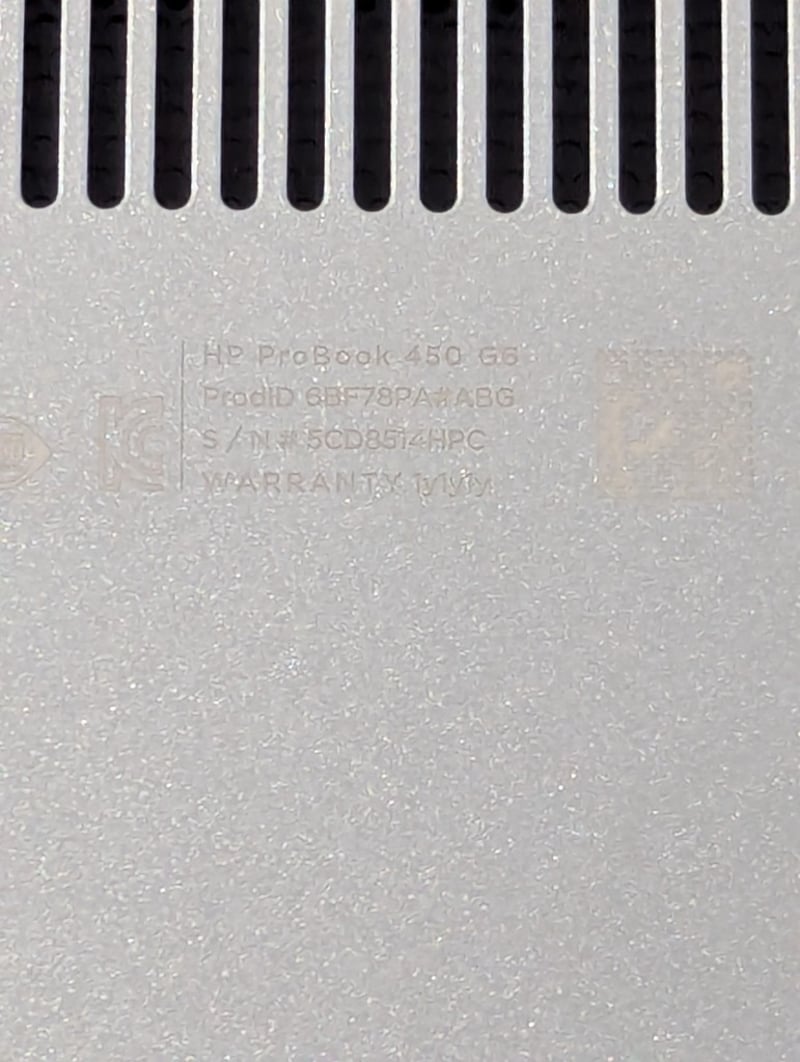 Laptop PC – HP ProBook 450 G6, 15.6” screen, Core i5 processor, 8Gb RAM, 256Gb SSD, S/N: 5CD8514HPC