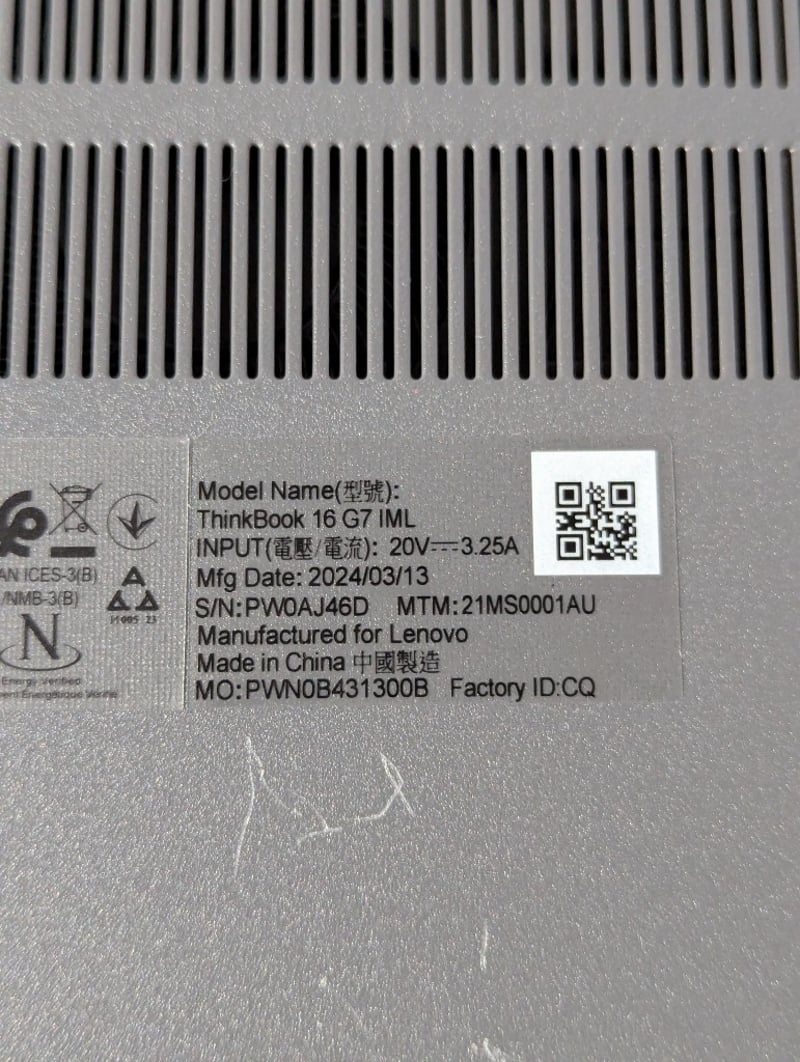 Laptop PC – Lenovo ThinkBook, 16” screen, 8Gb RAM, 256Gb SSD, S/N: PW0AJ46D
