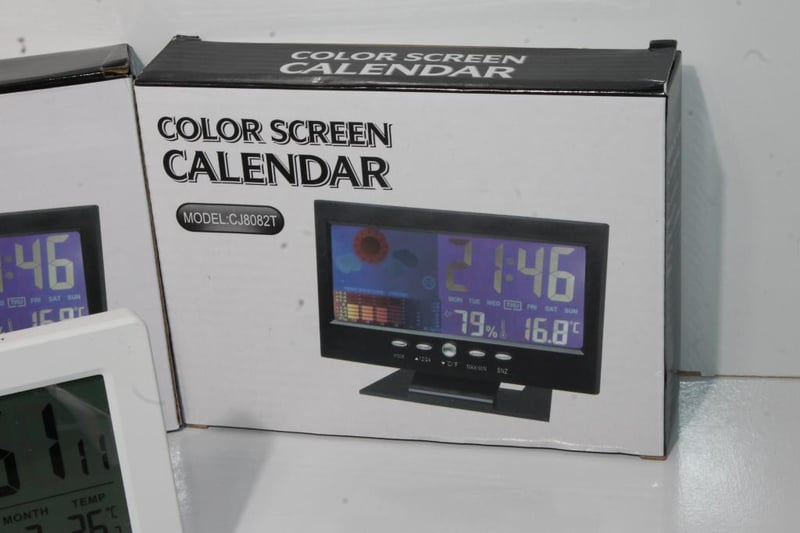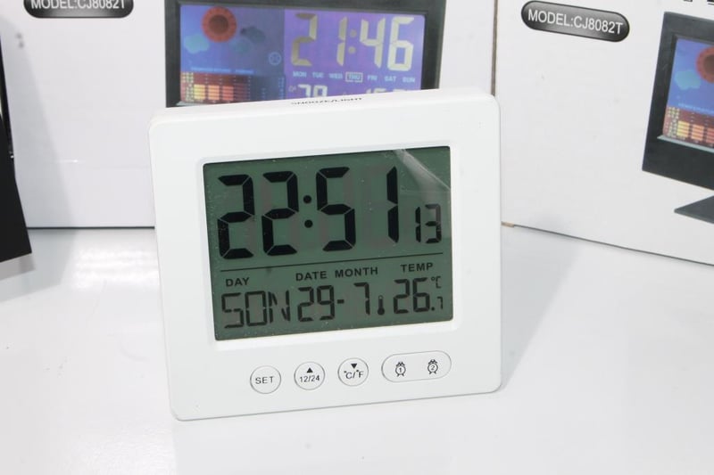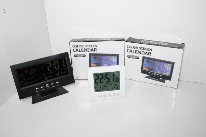 Colour Screen Calendar Clock Lot – CJ-8082T & LCD Clock (4 Units)Includes 3 Colour Screen Calendar clocks (Model CJ-8082T) 2 in original boxes and 1 white LCD calendar clock.