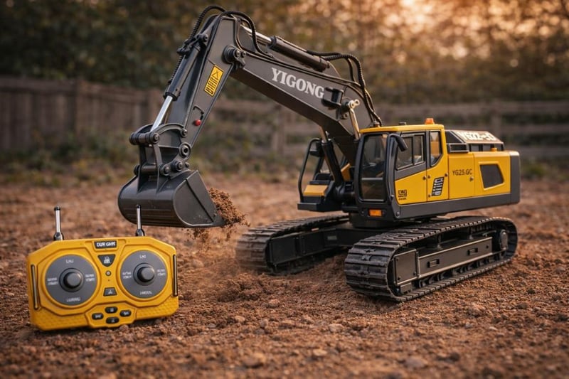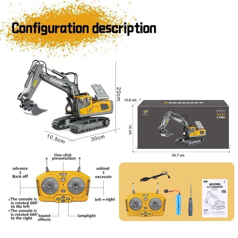 RC Excavator 2.4 GHZ 11 Channel Alloy & Plastic Constructions 360-degree Rotating Cabin Multiple Direction Control rubber tracks Sound and Lighting Function One Button Auto Demonstration USB Charging Approx 32cm Length 16cn Height (3 x AAA batteries needed for remote are not included) (NEW IN BOX) YELLOW (Sometimes in the creation of AI pictures and videos there may be very small differences in the product itself or size comparison, so these images are used only for the visual effect of the product shown, however the exact product with its specifications and size is always shown in the later photos so please be aware of this.)
