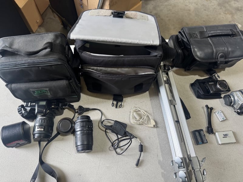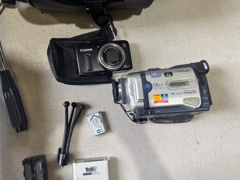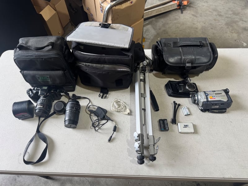 Cameras and accessories including, Sony and cannon Note: Sold as Lot