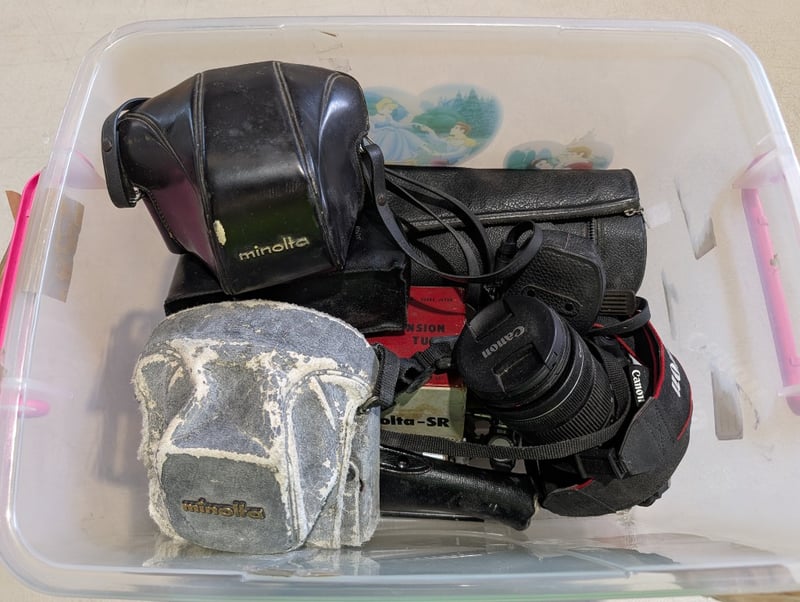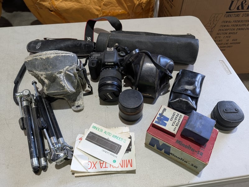 Cameras and Accessories Including Canon EOS760D, Telegraphic Lense, Minolta Cameras and MoreNote: Working Condition Unknown Sold As Lot