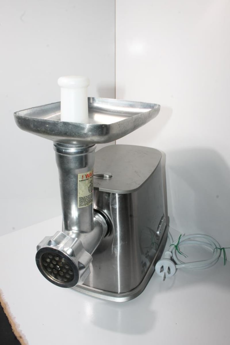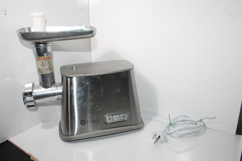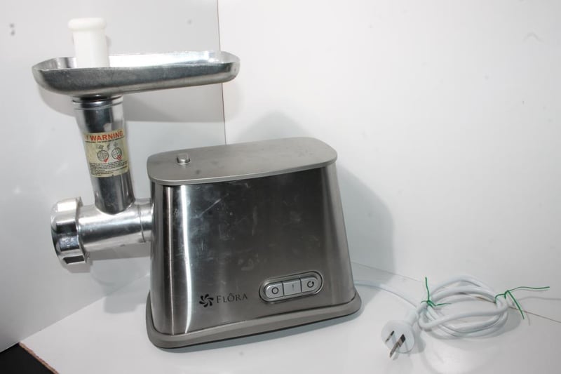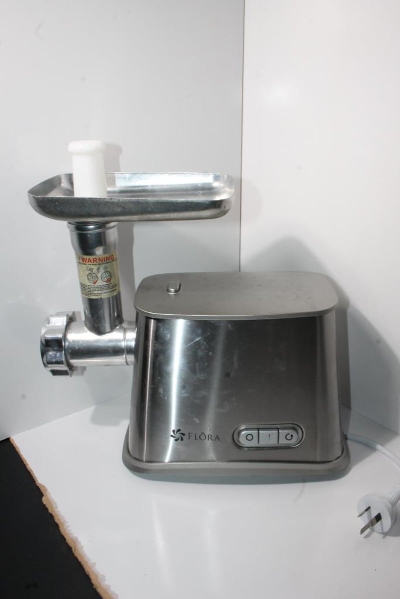 Flora electric meat grinder with stainless steel body, metal feed tray and auger housing, fitted with AU plug as pictured.