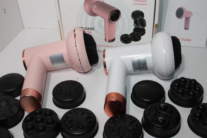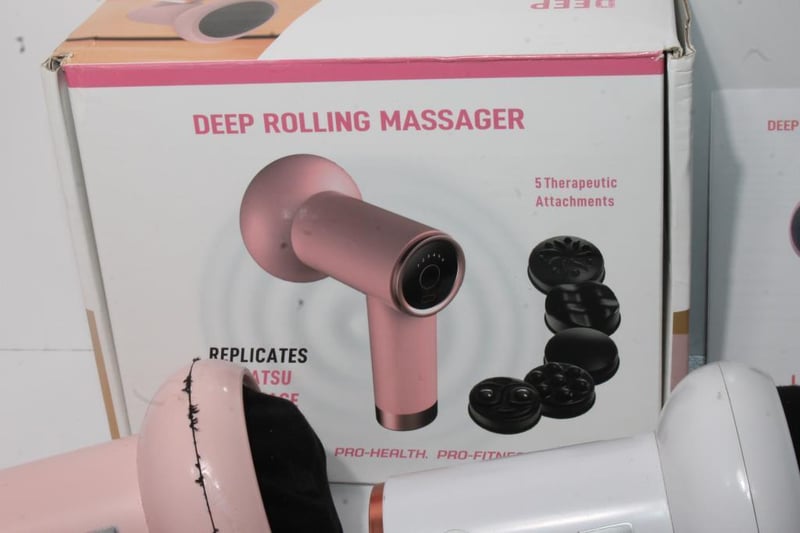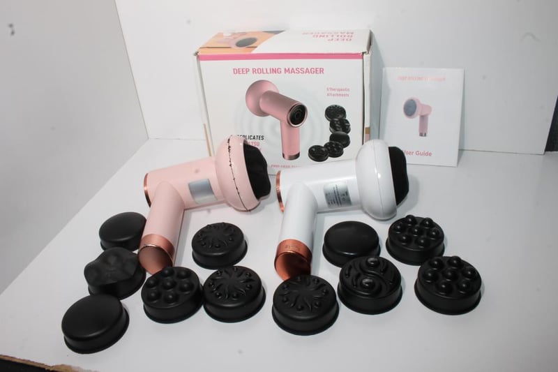 Includes two handheld deep rolling massagers (pink and white) with multiple interchangeable massage heads, original box and user guide.