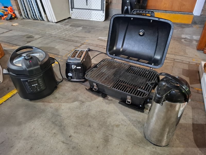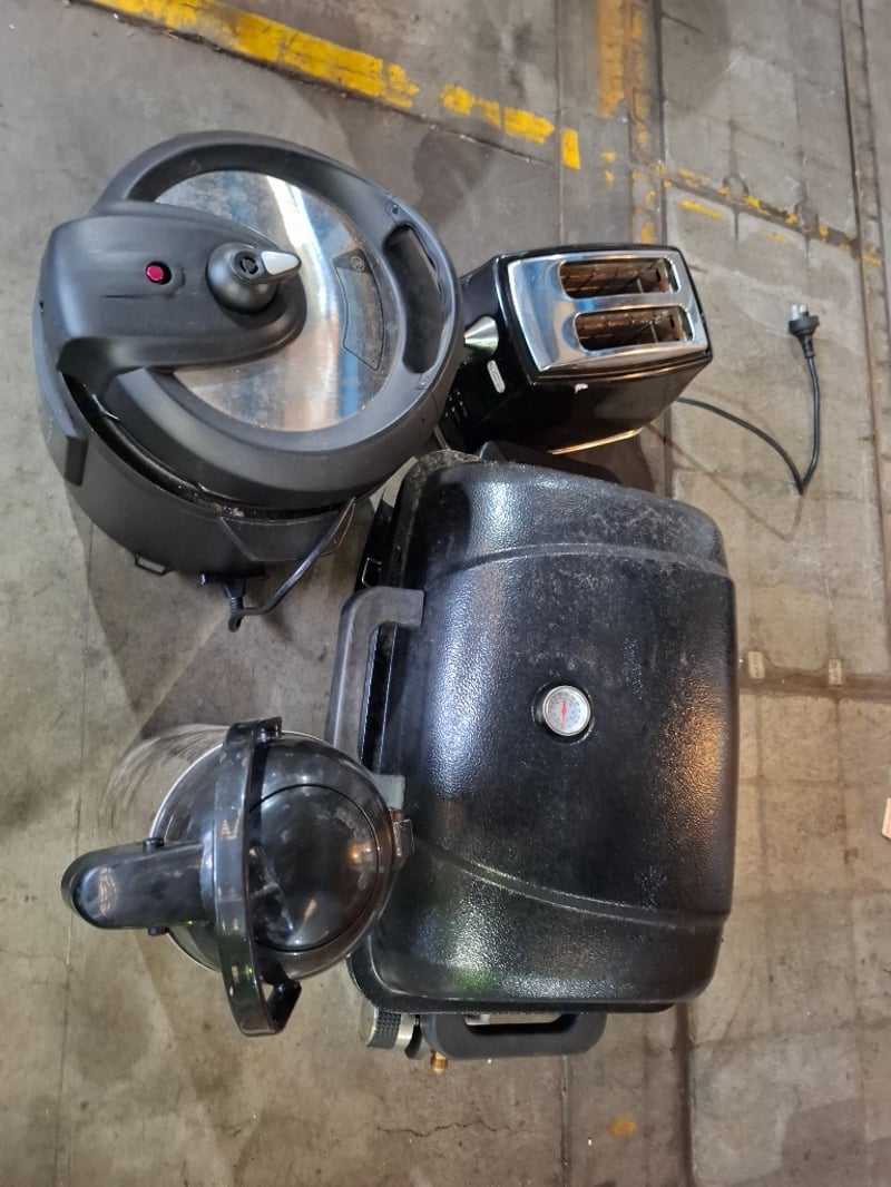 Asortment lot of appliances, includes digital multicooker, toaster, LPG BBQ, and a airpot dispenserSold as lot Note: Working condition unknown, cleaning required