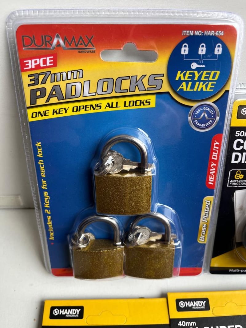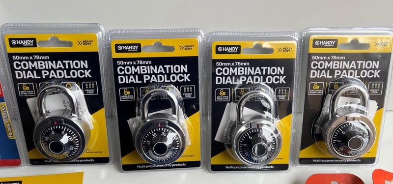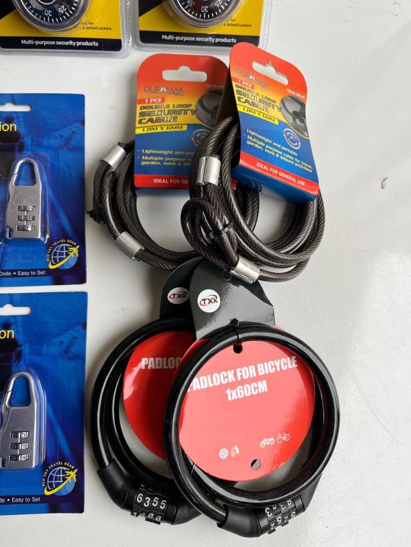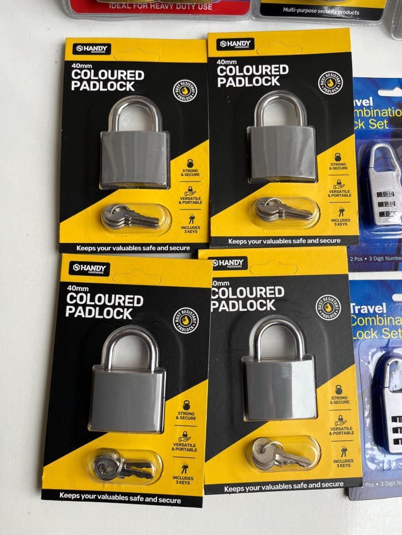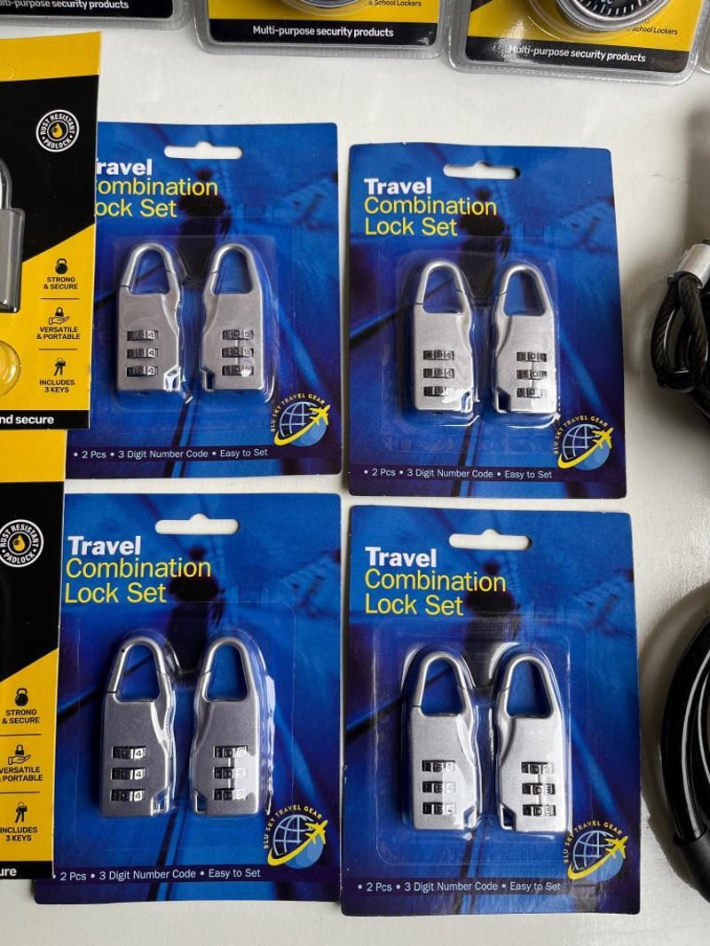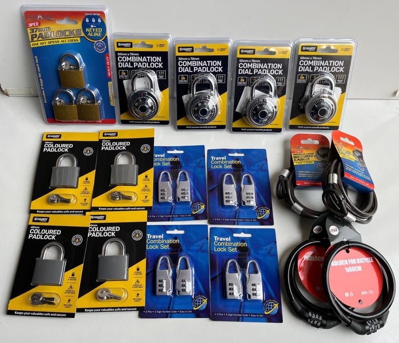 Box of Padlocks, including Keyed Alike Set of 4, Combination Suitcase, Combination Safe Style, Cable Locks and more, all brand new SOLD AS BULK LOT