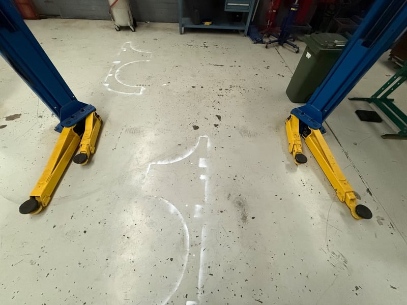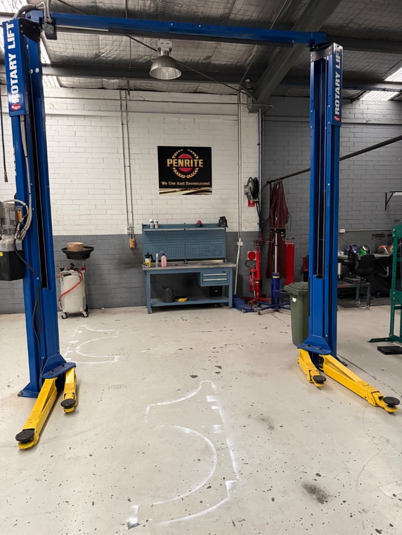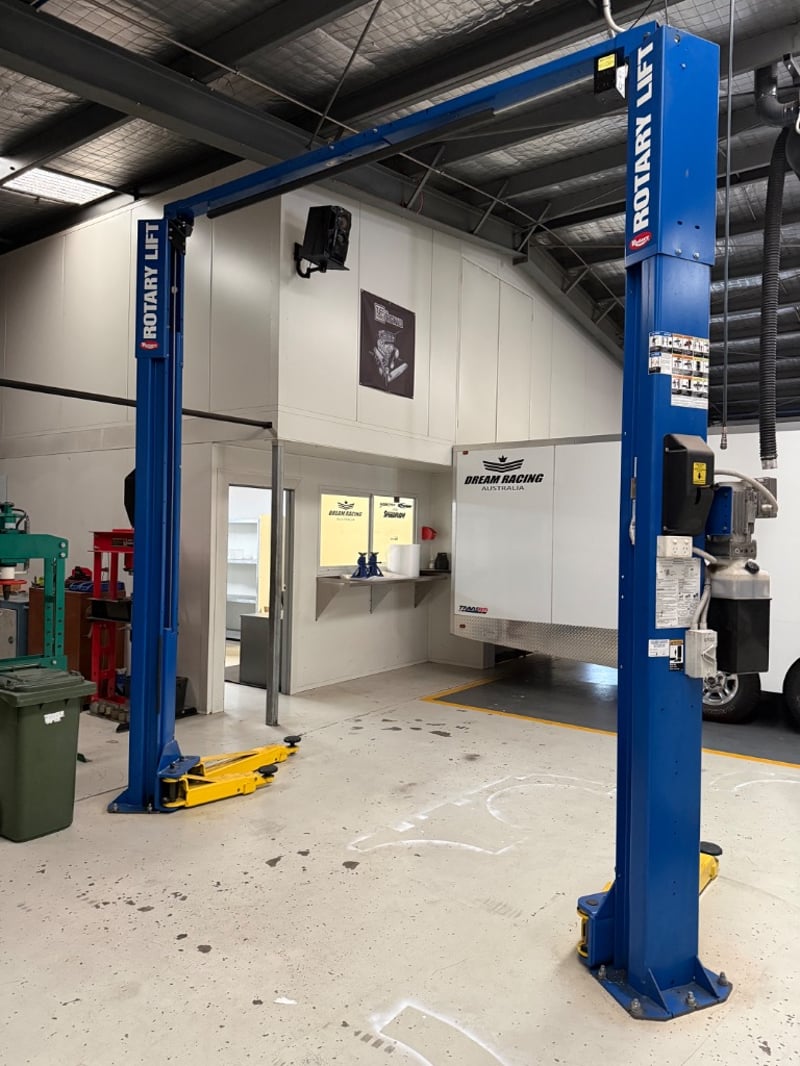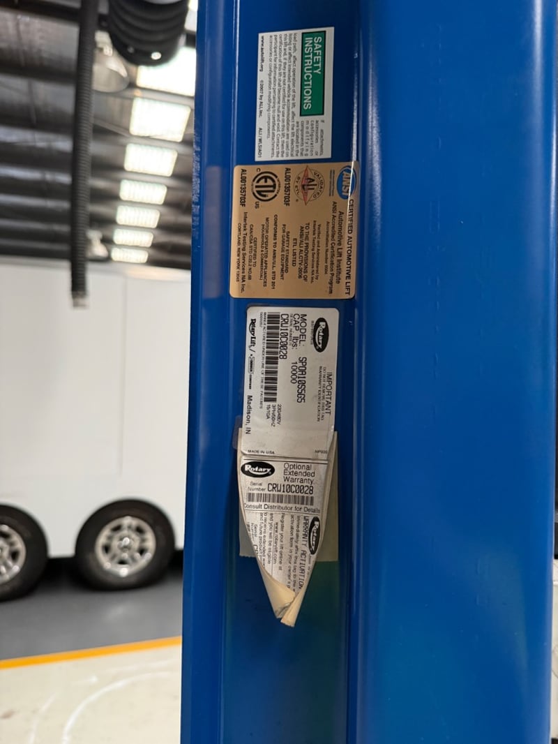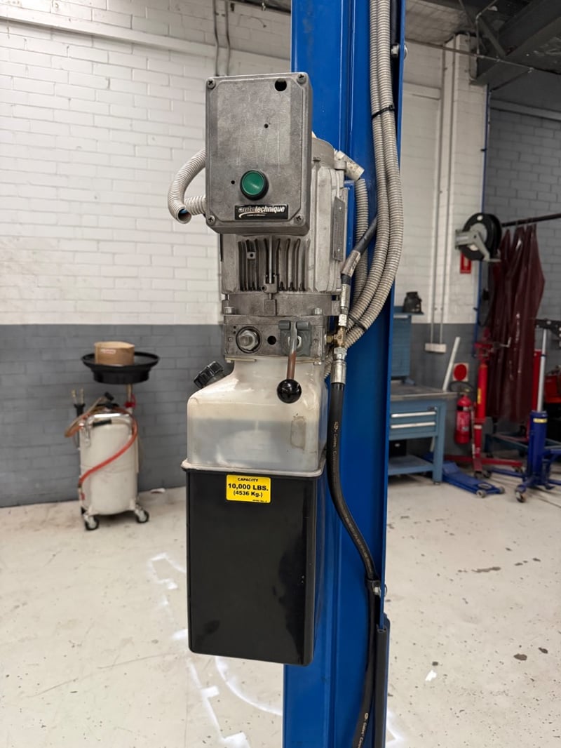 Car hoist, Rotary, Model: SP0A10S5G5, Capacity Lbs: 10000, Serial: CRW10C0028. Hydraulic Power Unit, Auto Technique, No: 08-4440259. Hoist is bolted into the ground, buyer to provide tools to remove.Hoist only, other items in image not included.