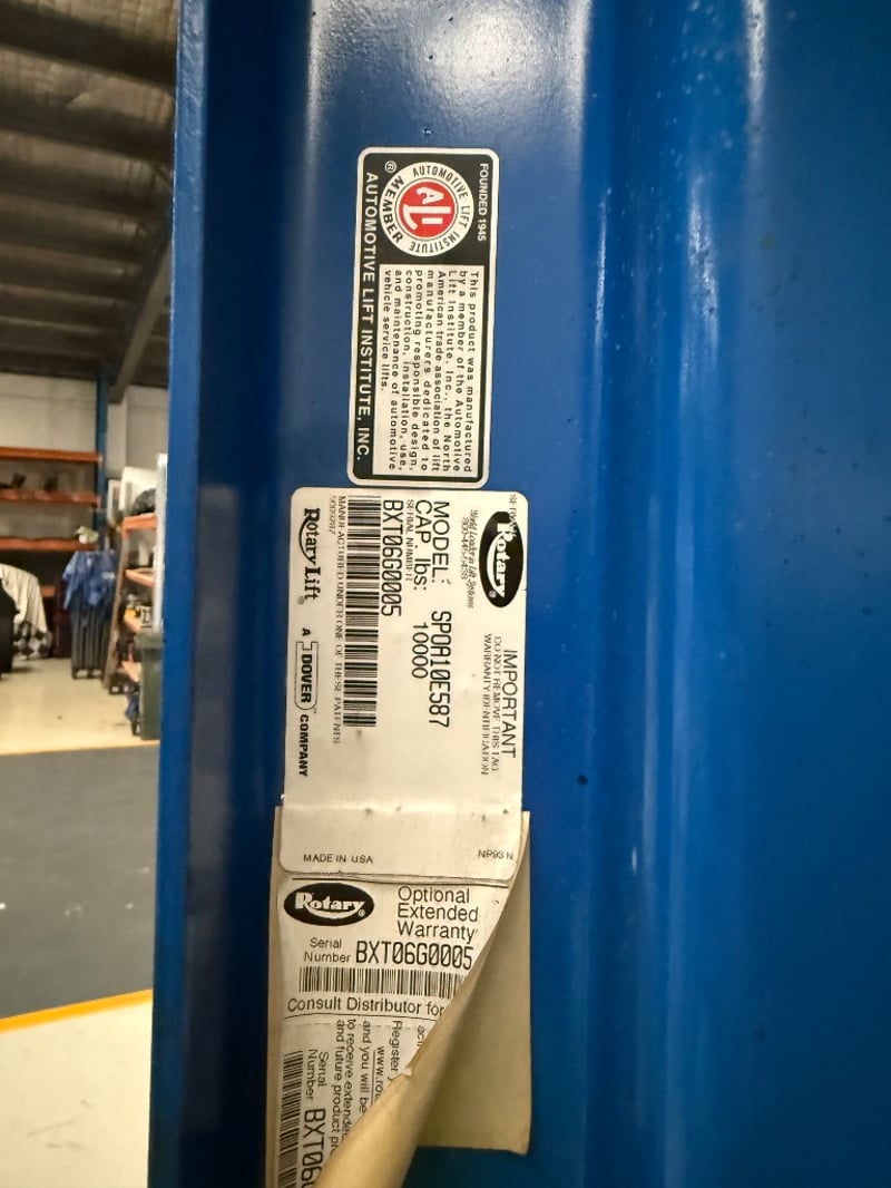 Car hoist, Rotary, Model: SP0A10E587, Capacity Lbs: 10000, Serial: BXT06G005.