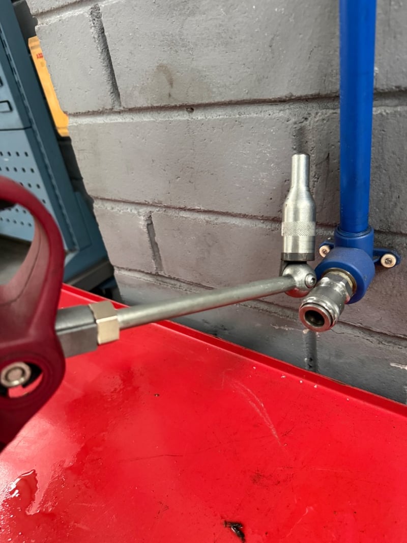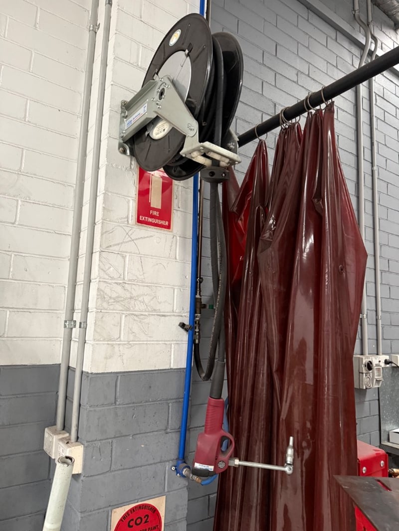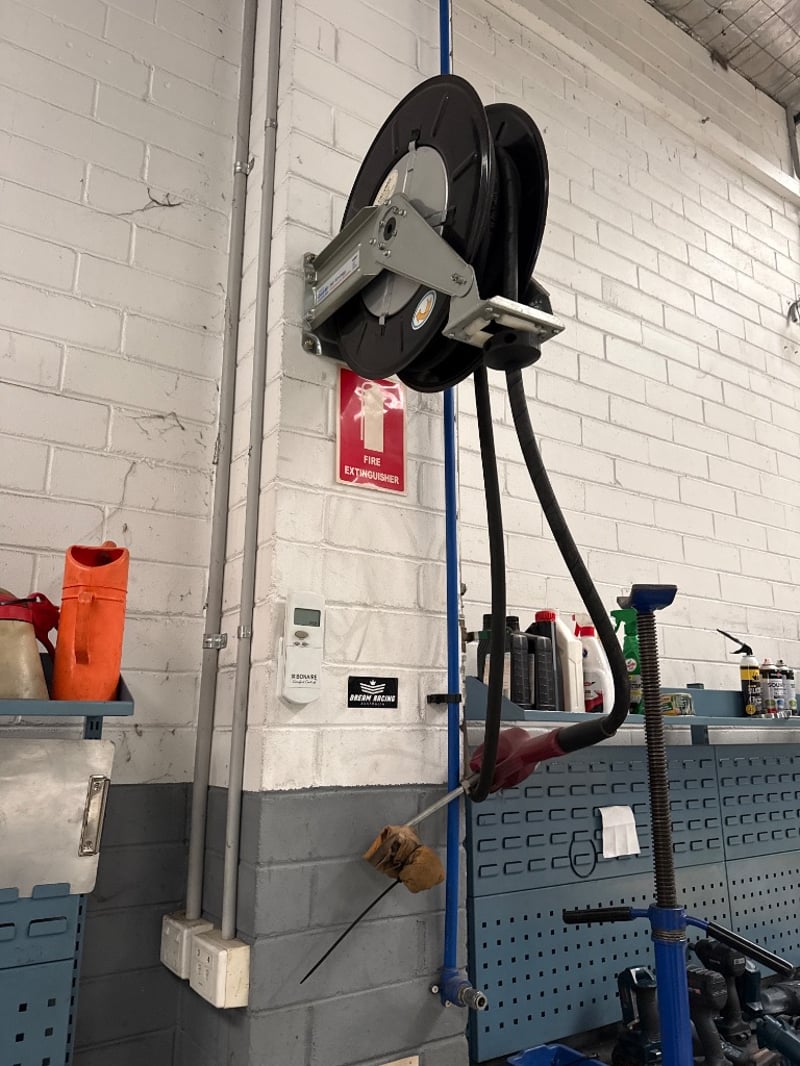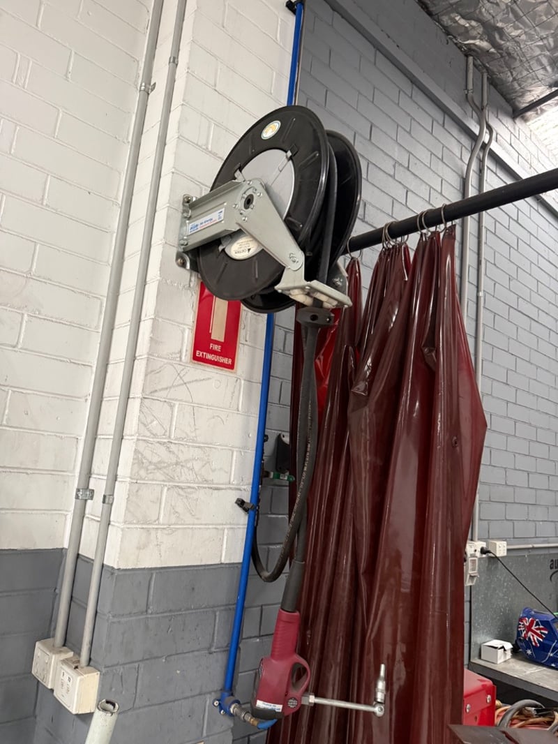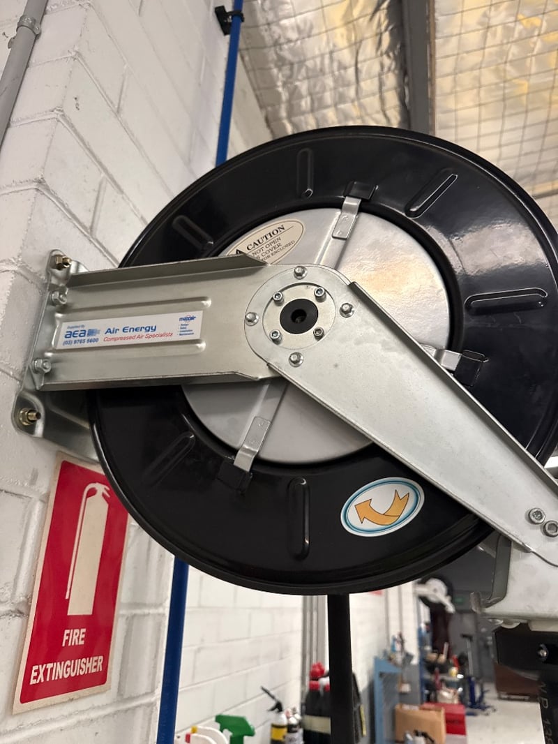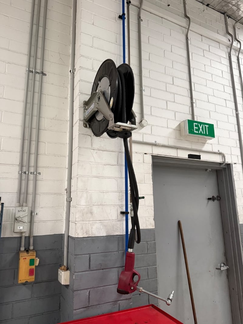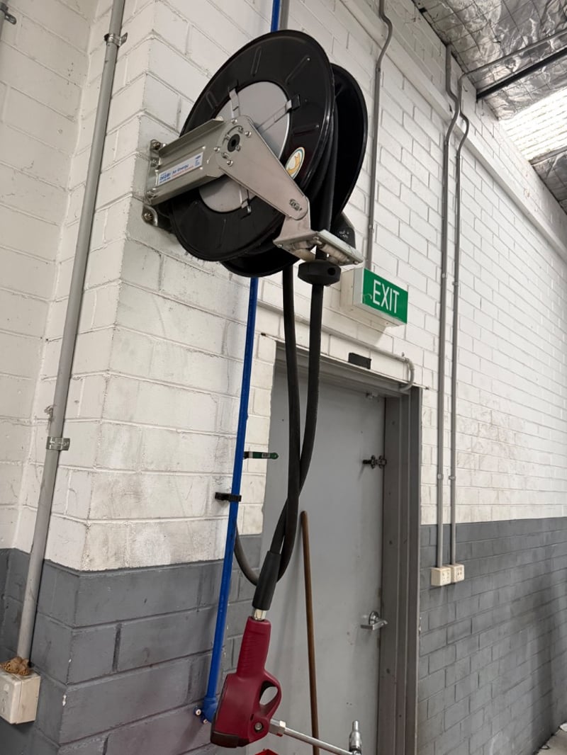 Compressed Air Hose reels, Air Energy, hoses are: SAE 100R1AT- 1/2”- W.P. 138BAR. 3 reels, sold as lot. Currently mounted on wall, Buyer must provide tools to remove.