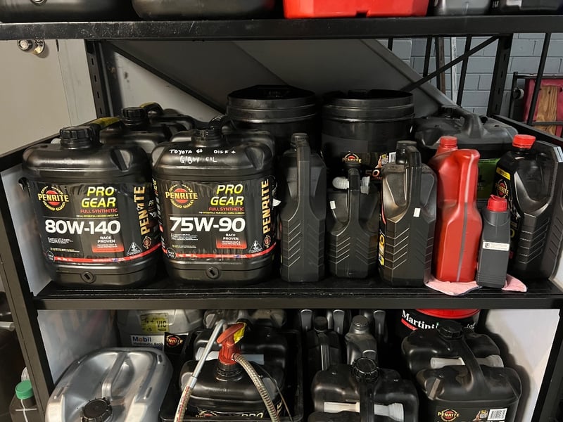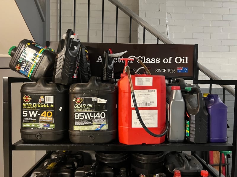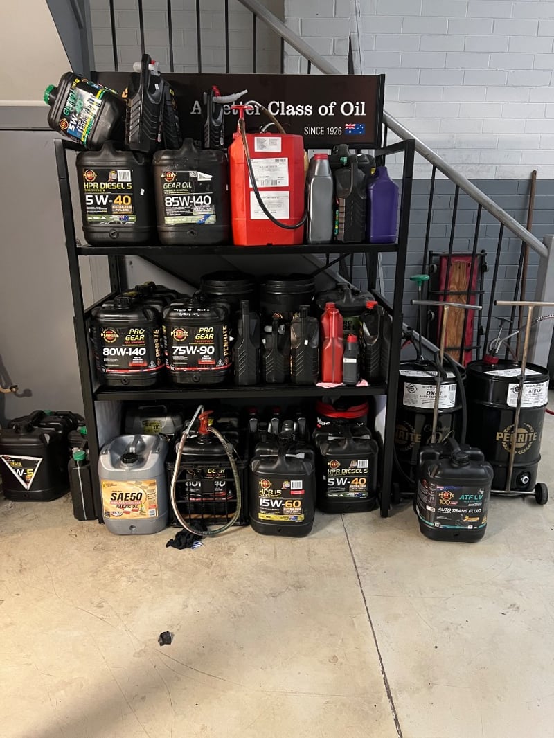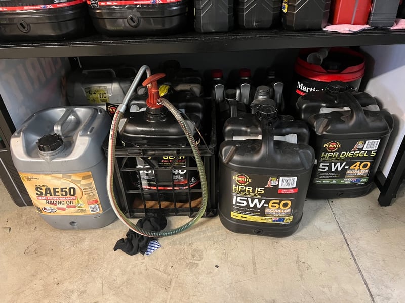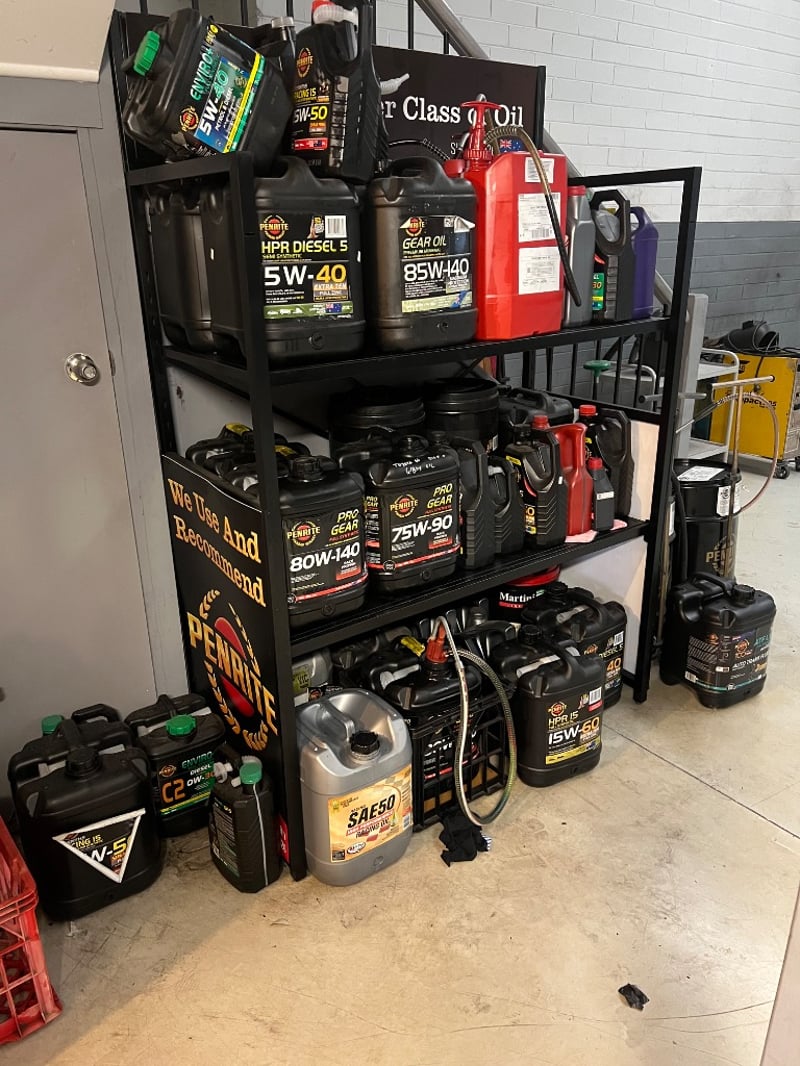 Assorted automotive lubricants including; 5W-40, 85W-140 gear oil, diesel, HPR 15, 20W-50 etc, some containers half full, full, empty and less than half full, includes shelf, inspection encouraged Sold as lot