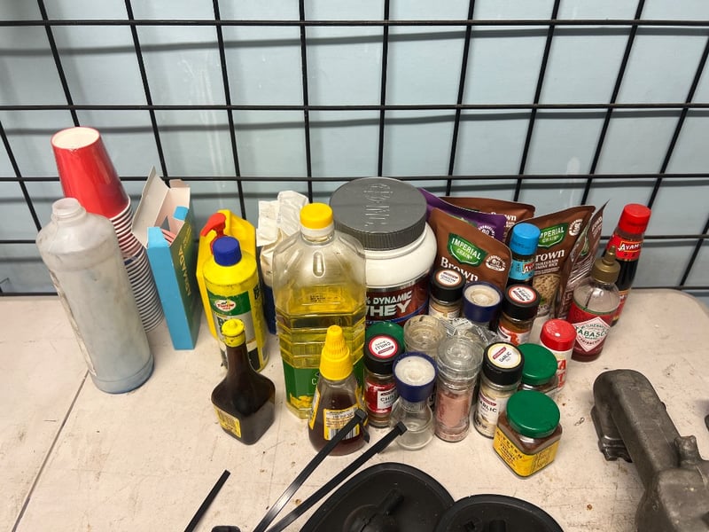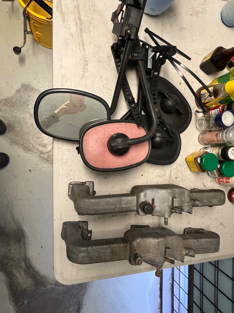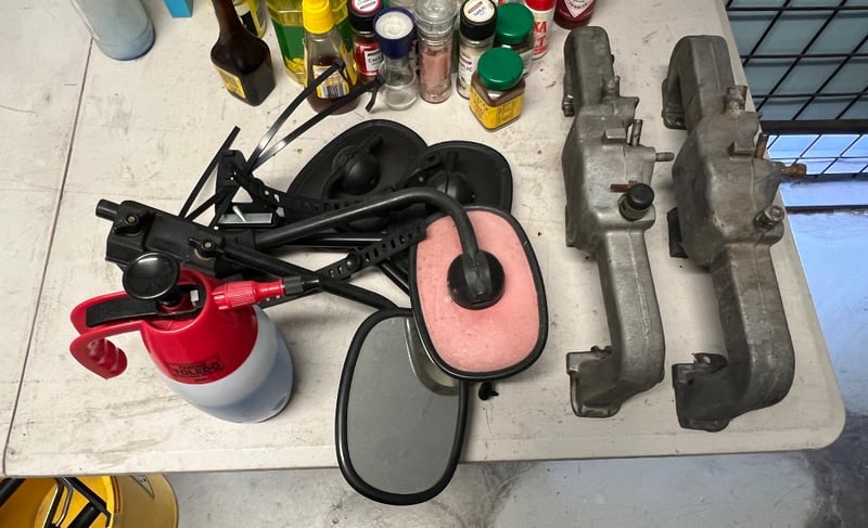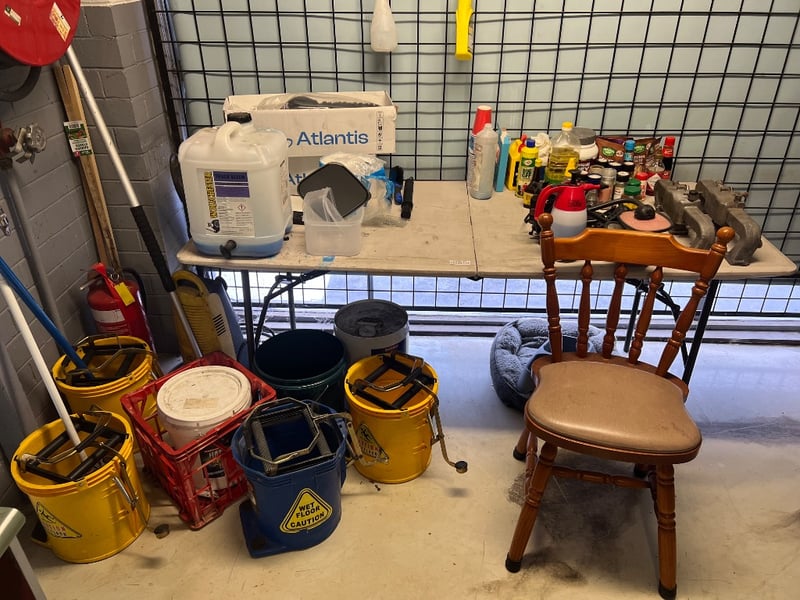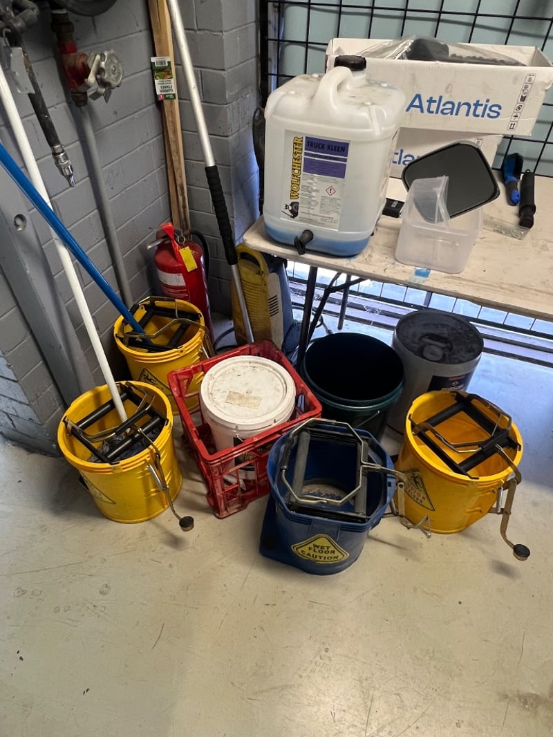Assorted equipment, including cleaning equipment such as mops, buckets, brooms, cordless vacuum cleaner etc, car equipment such as mirrors and intake manifolds, fold out table, chair etc
