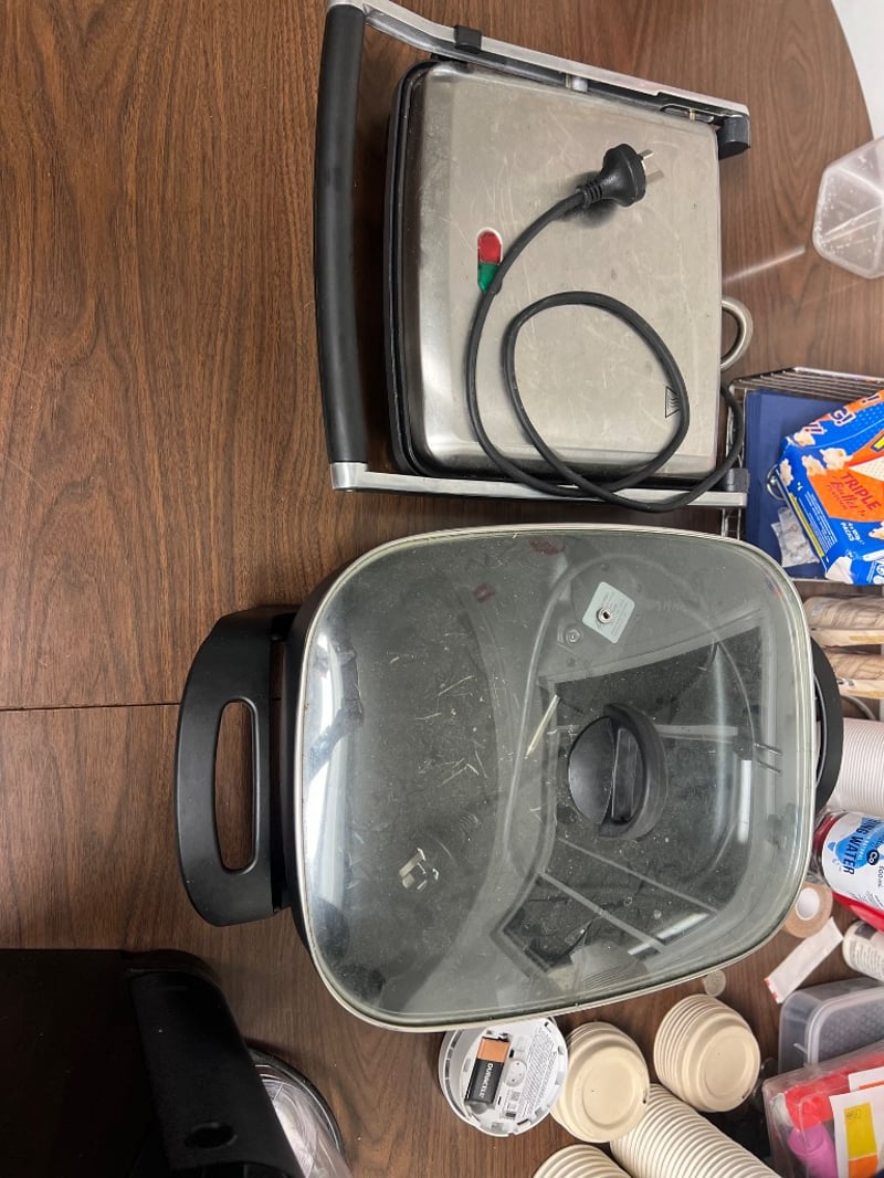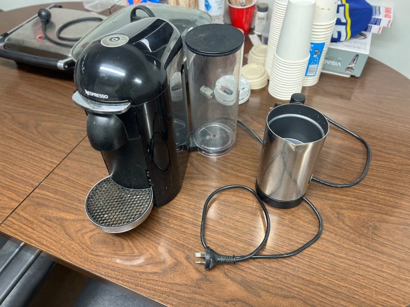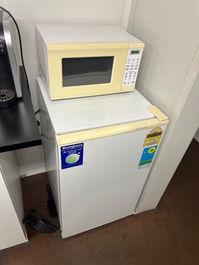 Assorted kitchen furniture/ appliances/ equiptment, including; table, 4 chairs, coffee machine, fridge, microwave, dish ware etcSold as lot