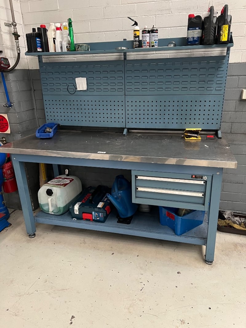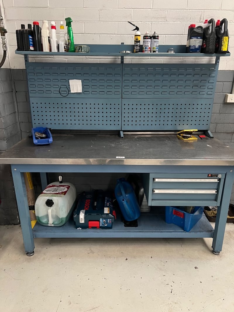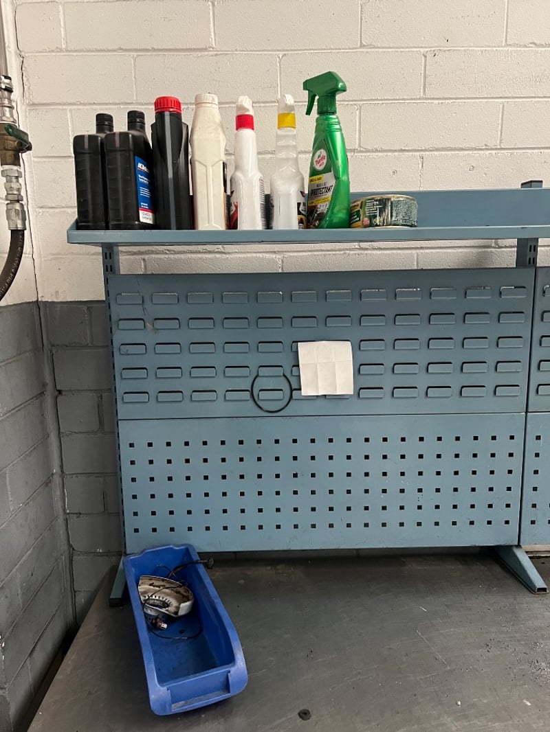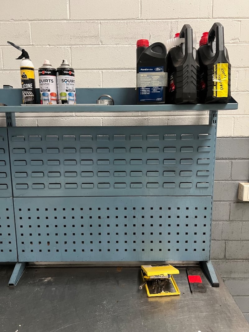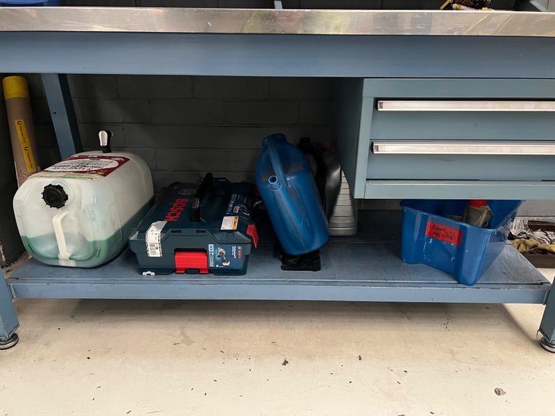 Work bench and assorted equiptment, including; used automotive maintenance lubricants and cleaners such as DP-PS, 80W-140 pro gear, protectant etc brands include; ford, Penrite, ACDelco etc