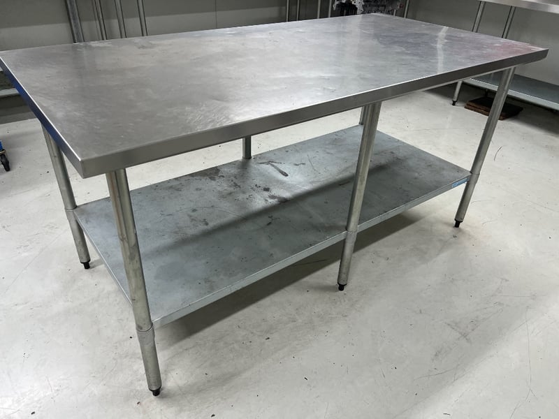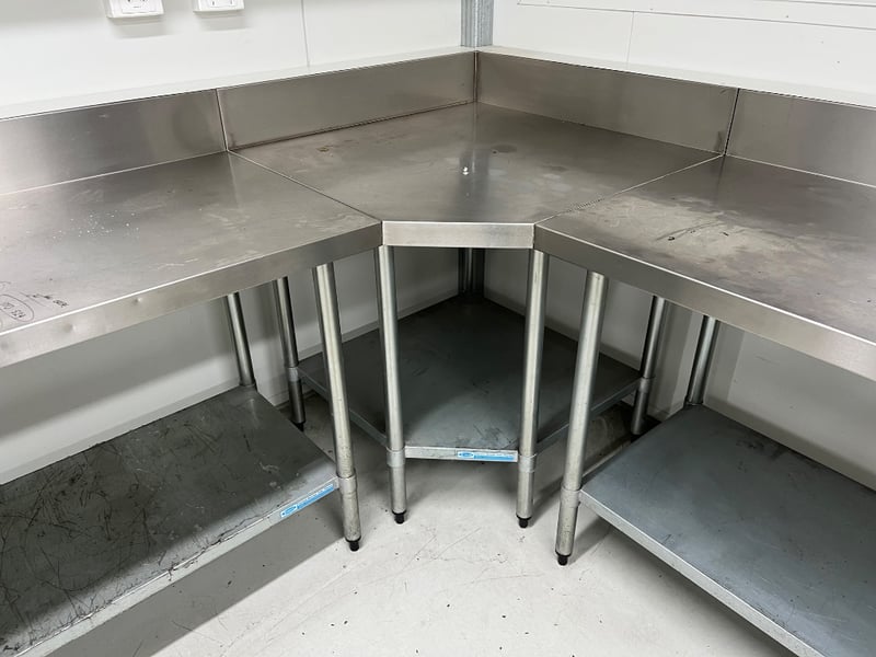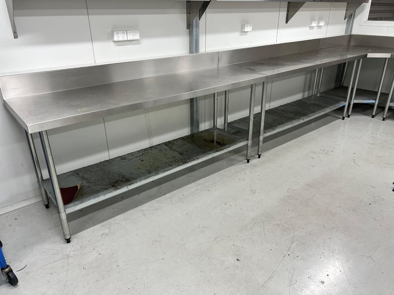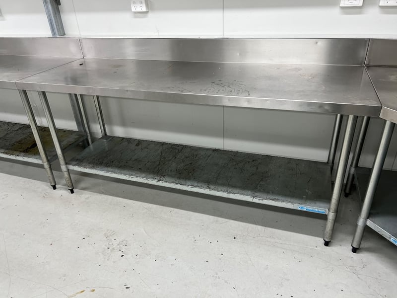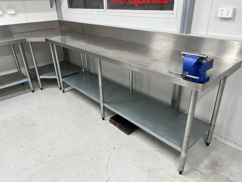 Stainless steel work benches with splash back. includes bench vise. tables attached via rivets, buyer to provide tools to remove. dimensions approx; 486W x 330W x 66D x 91 H cm and 90H x 183W x 91Dquantity; 5 sold as lot