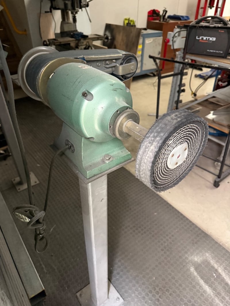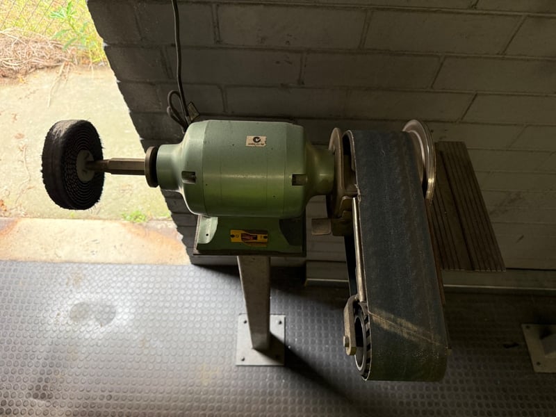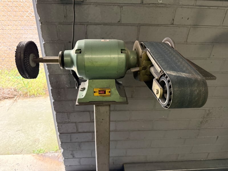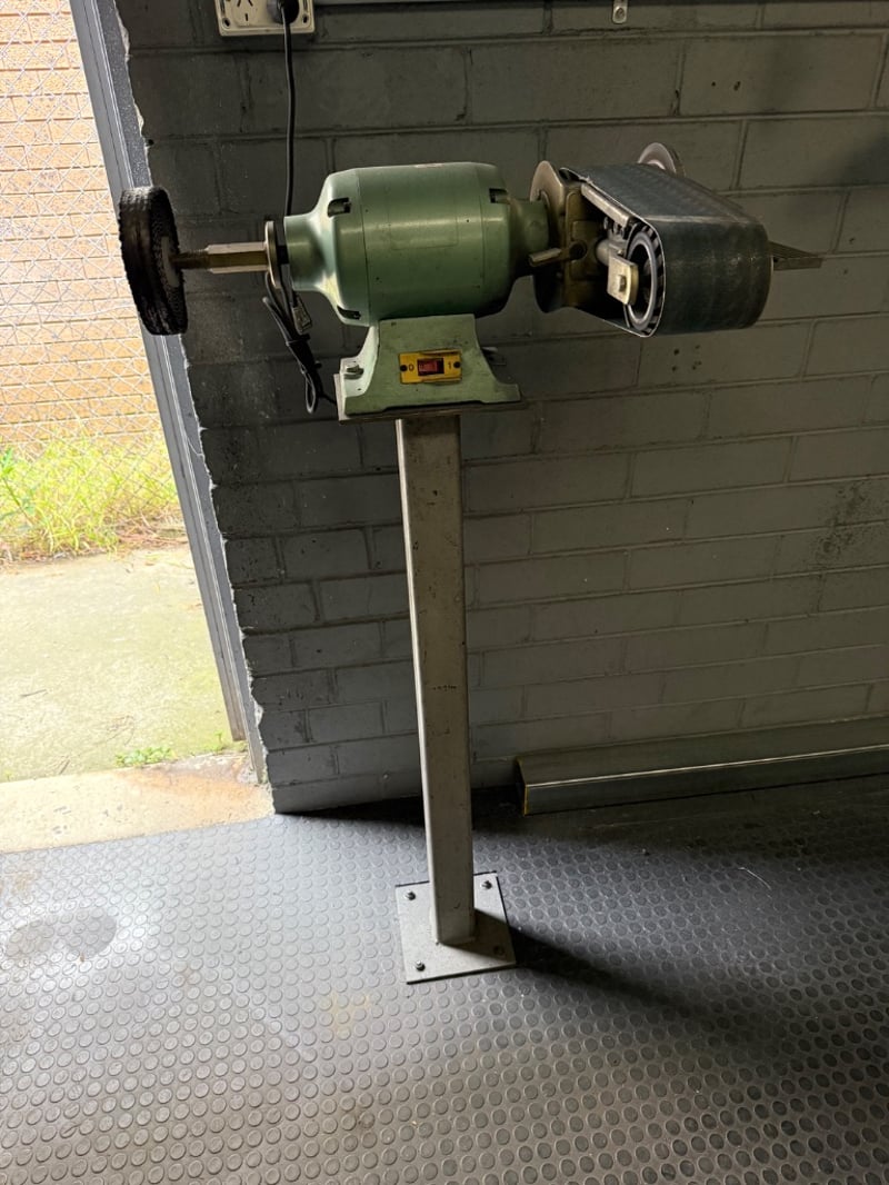 Bench Grinder, Mounted on stand. Industrial. Approx Dimensions: 135h X 75w X 50d.