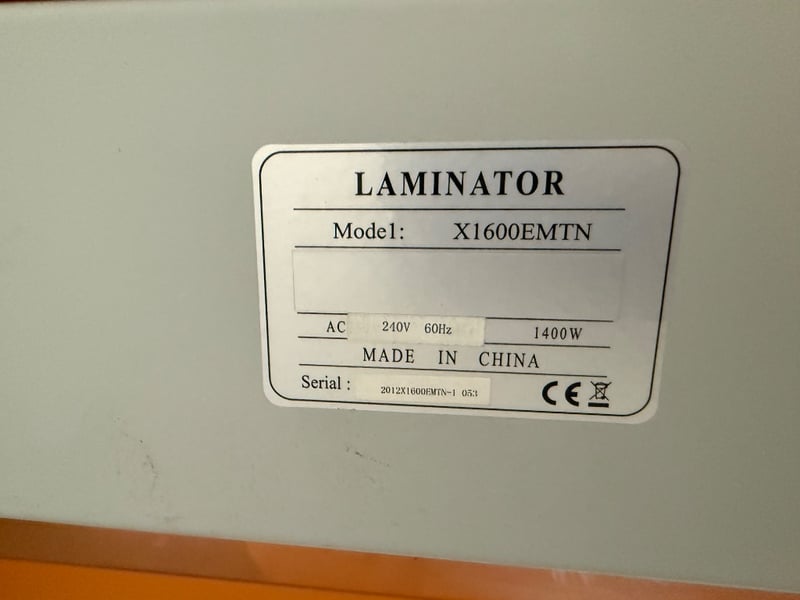 Laminator, ICO, Model: X1600EMTN, Serial: 2012X1600EMTN-1 053. 240v 60hz. Approx Dimensions: 120h X 220w X 80d.