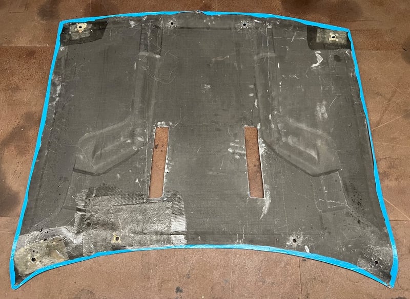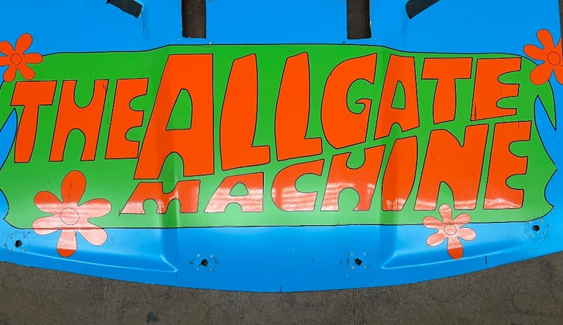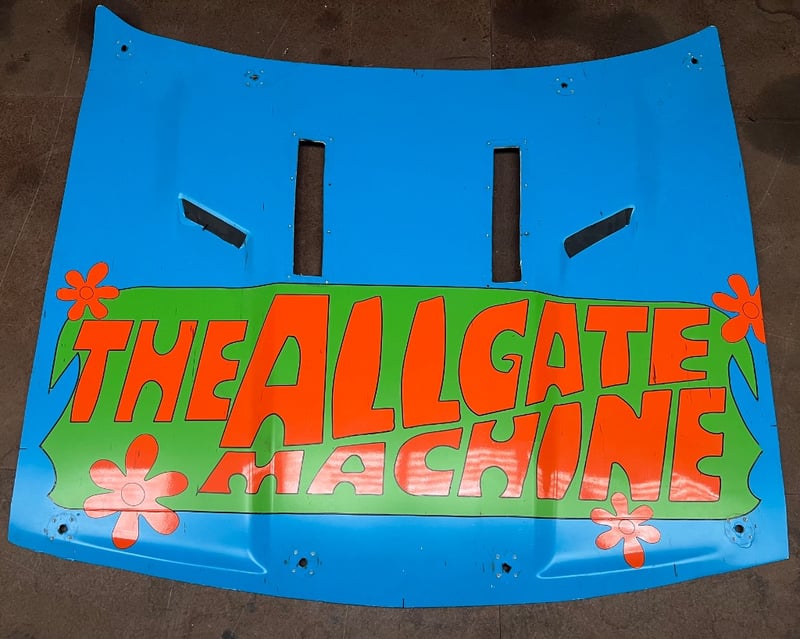 Car hood, features a blue, orange and green design, 'The Allgate Machine', pre-drilled holes and cutouts