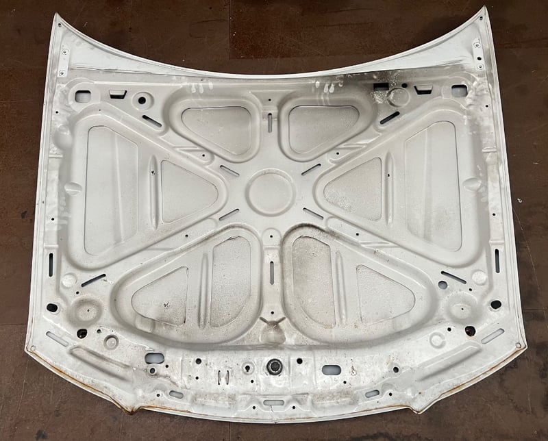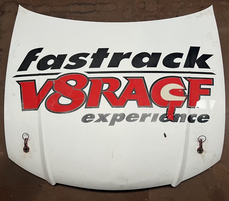 Car hood, white, featuring bonnet pins and 'fast track V8 race experience'