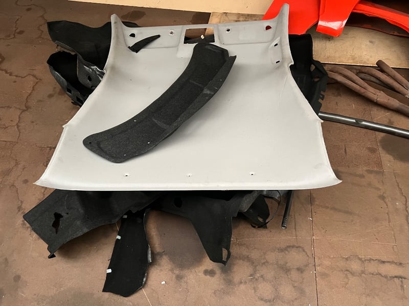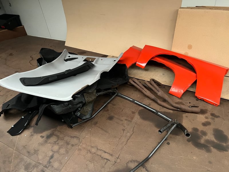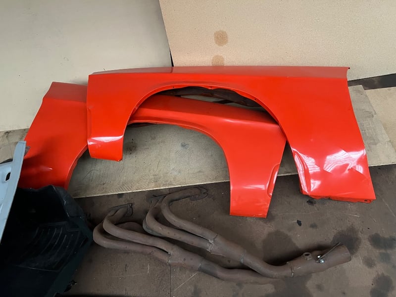 Assorted automotive parts, including, Red fenders, roll cage component, exhaust headers, interior roof panel etcsold as lot