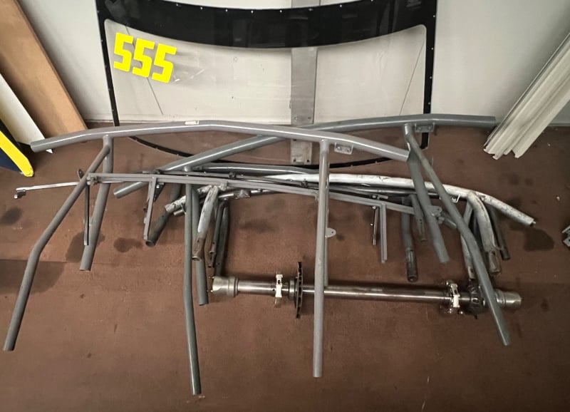 Assorted automotive parts, including roll cage and windscreen displaying '555'