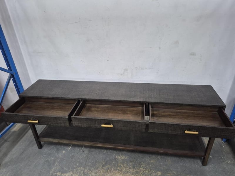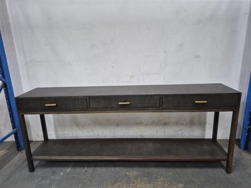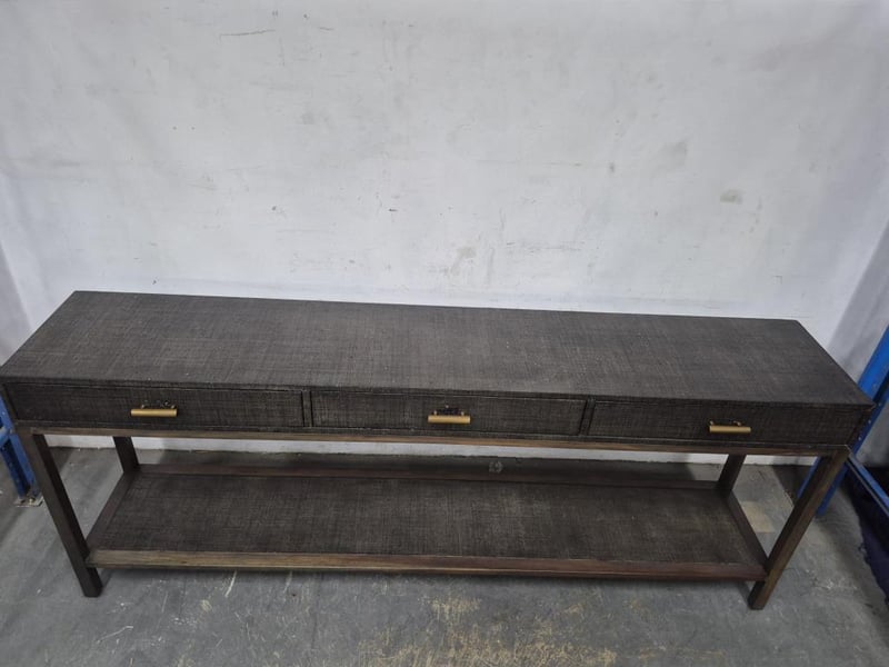 Hallway table woven wooden design with bronze coloured handles top has slight damage Dimensions Height: 86cm Width: 210cm Depth: 40cm