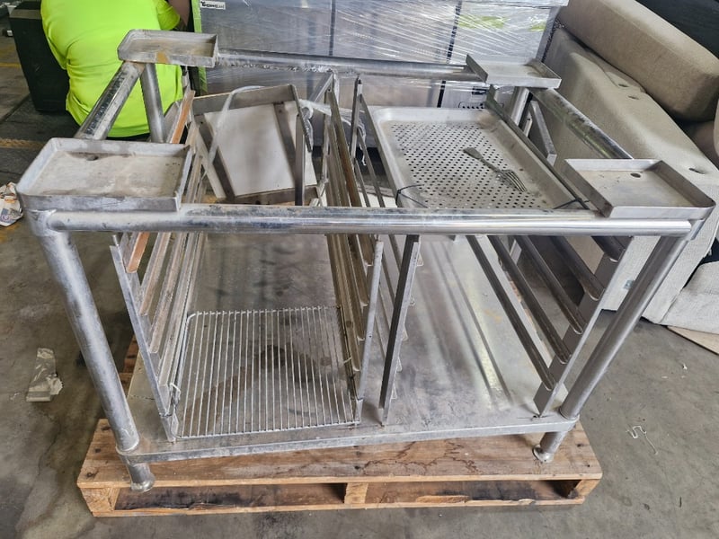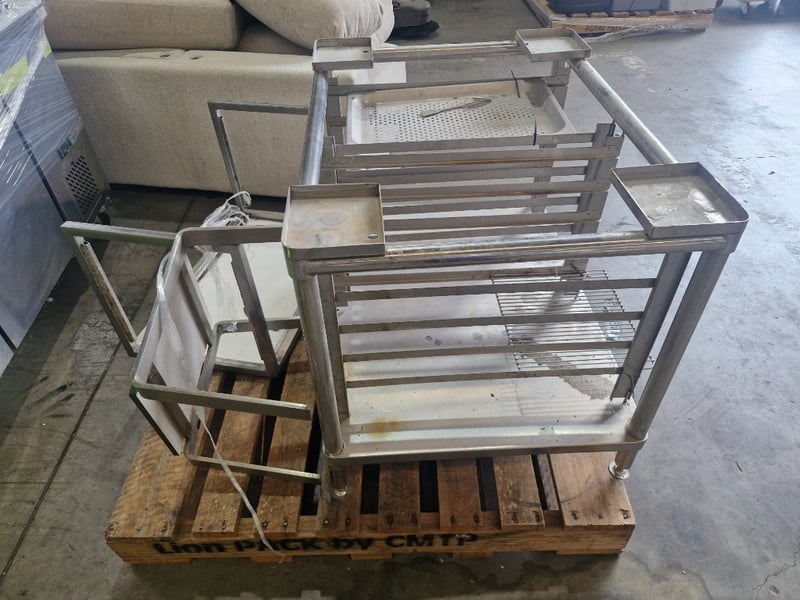Stainless steel underbench shelves, with some trays, contents to pallet. SOLD AS LOT