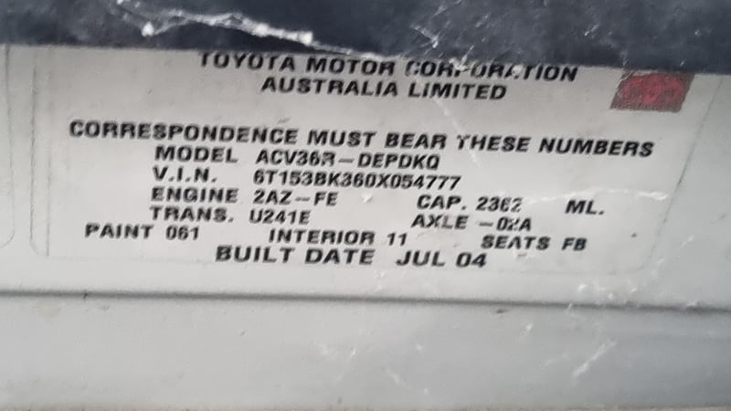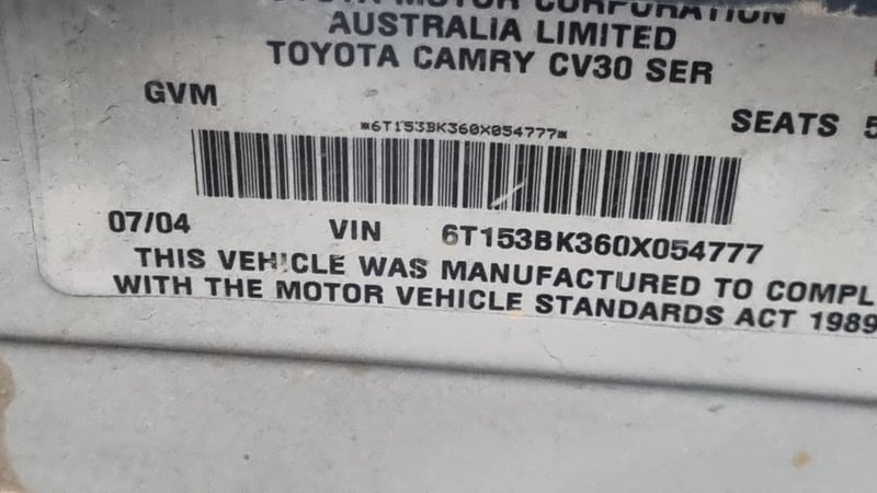 2004 Toyota Camry ACV36R Altise Year: 2004 Make: Toyota Model: Camry Series: ACV36R Badge: Altise Body: 4-Door Sedan Drive Type: Front wheel drive Odometer: Indicating 128,688 Kilometers Engine: 2.4 I4 Petrol Transmission: 4-Speed Automatic Colour: White Seats: 5 Description/extras: Air Conditioning, Power windows, Cruise control, Central locking, CD player, Log books/Owners manual. Marks And Scratches, Paint imperfections See Photos and Video. VIN: 6T153BK360X054777 ENG No: 2AZA167711 (Key #Nc24) Lloyds stock #1041835+1 #PCV