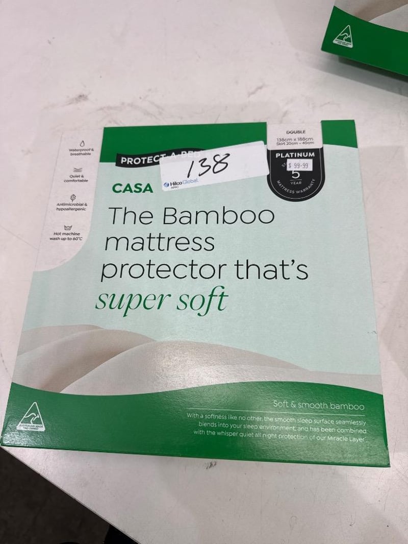 RRP: $399, "Protect-A-Bed Bamboo Jersey Mattress Protector - DoubleBamboo Jersey: Absorbent and durable, the smooth fiber of rayon, made from bamboo, offers a soft and comfortable sleep surface.Features Include: