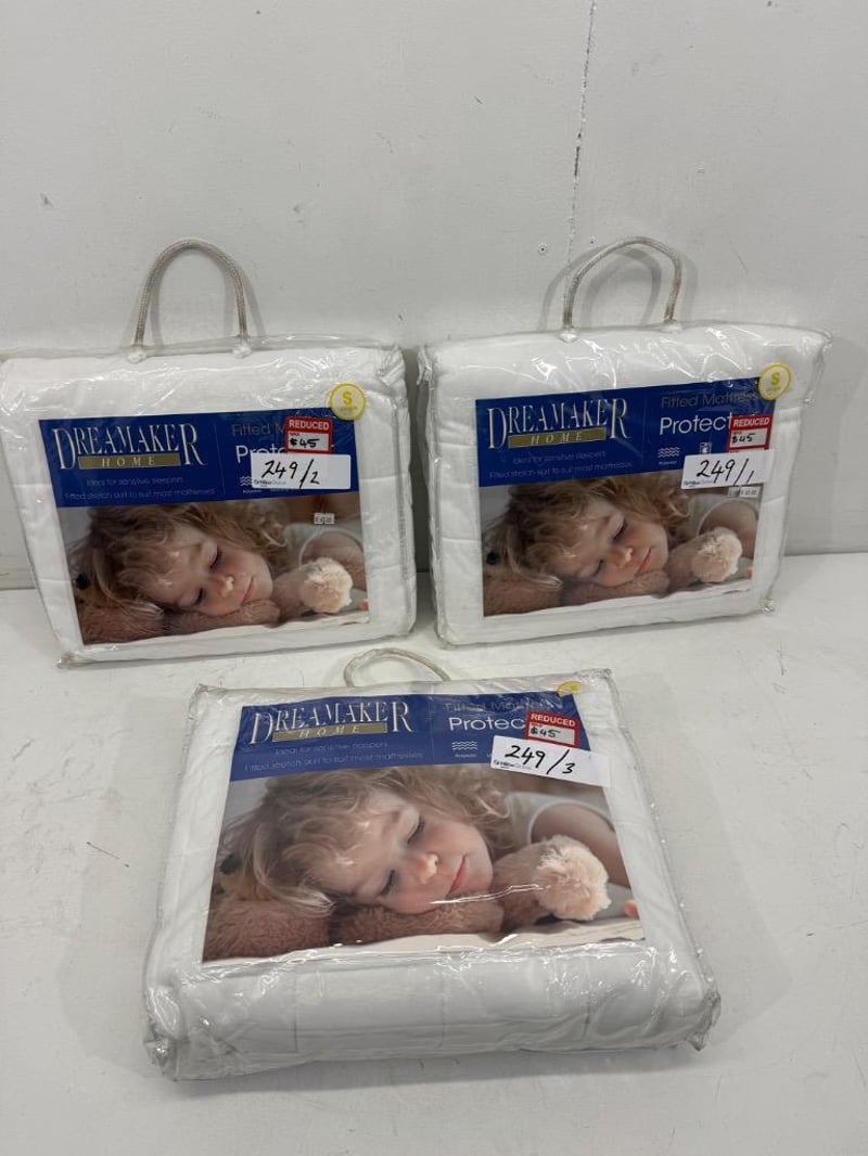 RRP: $135, Qty of 3 Dreamaker Home Fitted Mattress Protecter - Single. Quantity-3 Sold as lot