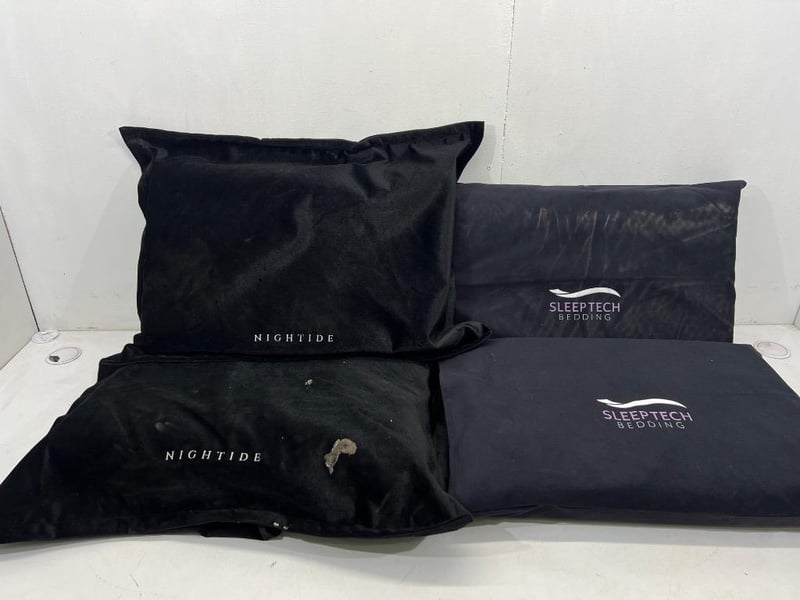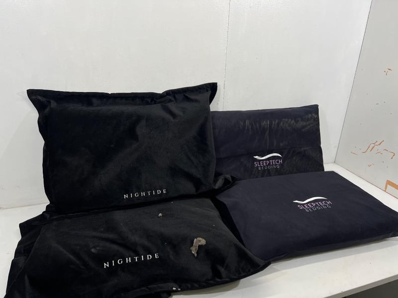 Pillows, brands include; Nightide, sleep tech, assorted sizes, navy/black colours Quantity; 4, sold as lot