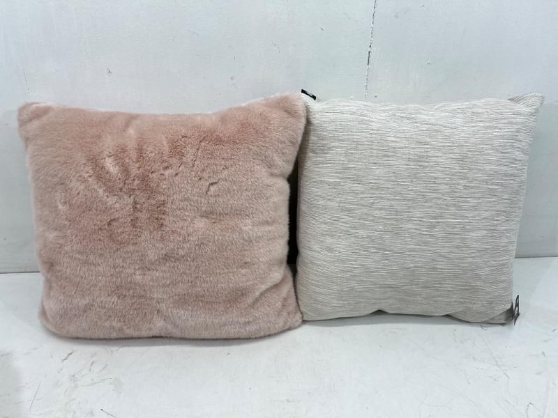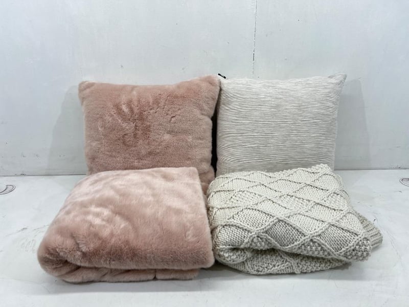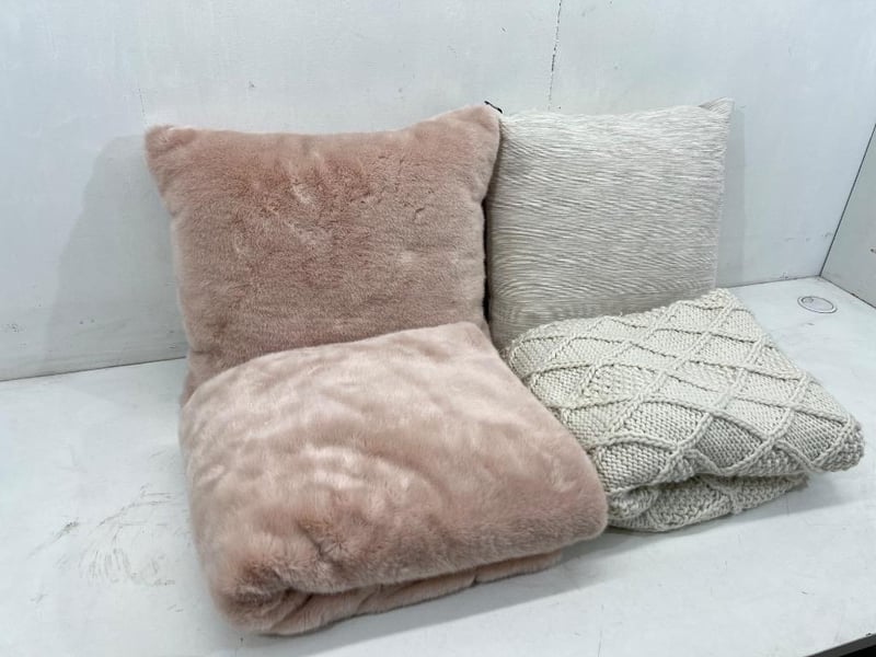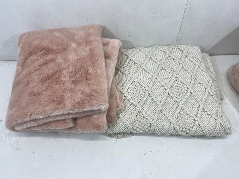 Bedding, brands include; madras link, Kas etc, includes; throw blankets, pillows, pink/ grey type colourSold as lot