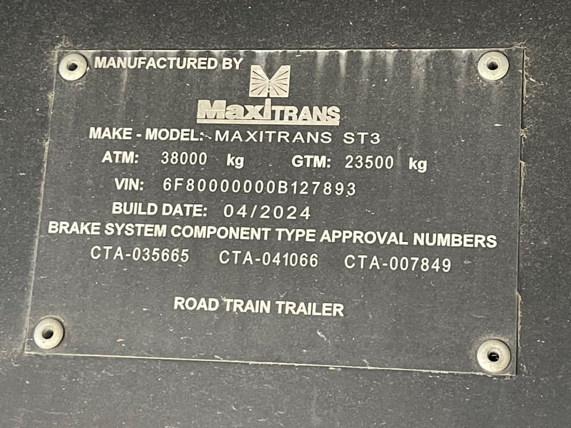 2024 MaxiTrans ST3 Flatbed Tri Axle A Trailer Year: 2024 Make: MaxiTrans Model: ST3 Body: Flat Bed A Trailer Colour: White Configuration: Tri axle Suspension: Air Bag ATM: 38,000 kg GTM: 23,500 kg Chassis No.: 6F80000000B127893 Total length Approx: 10.4 m or 33 Feet Description: Headboard, JOST turntable, Right Weigh scales, x2 toolbox, Pullout storage, ATP system. SOLD UNREGISTERED