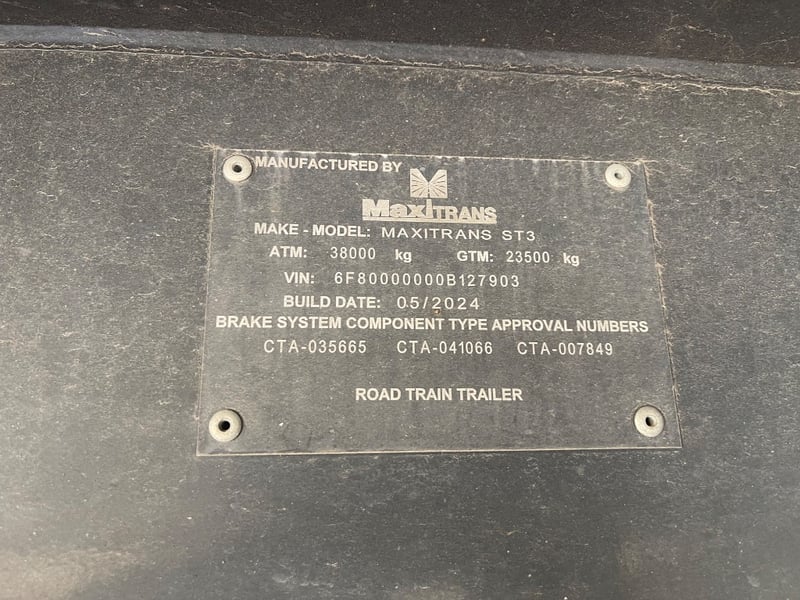 2024 MaxiTrans Flatbed A Trailer Year: 2024 Make: MaxiTrans Model: ST3 Body: Flatbed A Colour: Grey Configuration: Tri axle Suspension: Hendrickson Air Chassis No.: 6F80000000B127903 ATM: 38,000kg GTM: 23,500 kg Total length approx : 10.4 m or 33 feet Description: Right Weigh Scale, x2 toolbox, Headboard, ATP System, Chuck Storage. Jost turntable SOLD UNREGISTERED