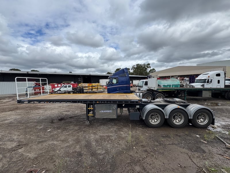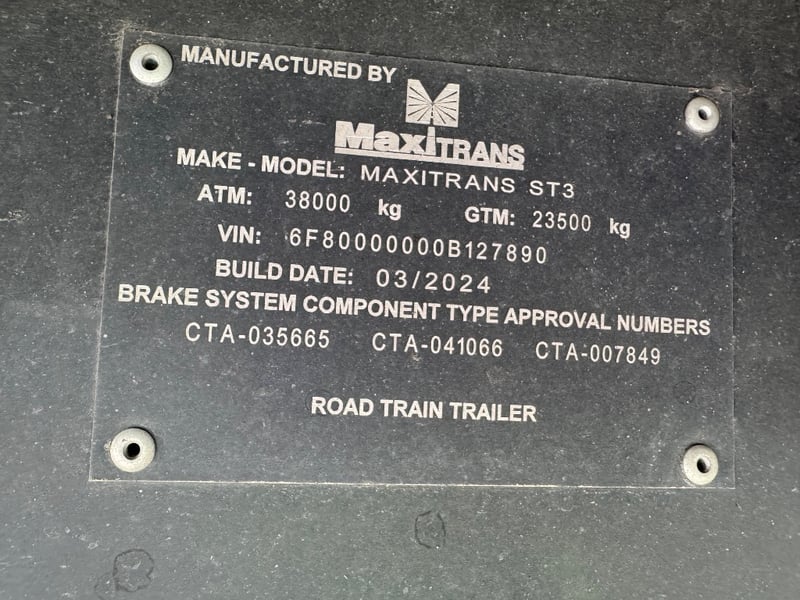 2024 MaxiTrans ST3 Flatbed Tri Axle A Trailer Year: 2024 Make: MaxiTrans Model: ST3 Body: Flat Bed A Trailer Colour: White Configuration: Tri axle Suspension: Air Bag ATM: 38,000 kg GTM: 23,500 kg Chassis No.: 6F80000000B127890 Total length Approx: 10.4 m or 33 Feet Description: Headboard, JOST turntable, Right Weigh scales, x2 toolbox, Pullout storage, ATP system.