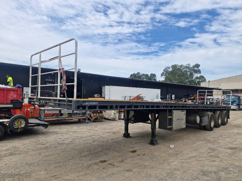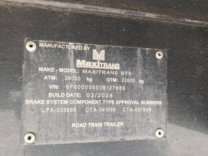 2024 Maxitrans semi B Trailer Year: 03/2024 Make: Maxitrans Model: ST3 Body: Flat Top Configuration: Tri Axle Suspension: Airbag Length: 13.4m or 44ft VIN: 6F80000000B127888 Description/Extras: Rear Headboard, Beacon Light , Axle Scales TARE WEIGHT: 23500kg ATM: 38000kg