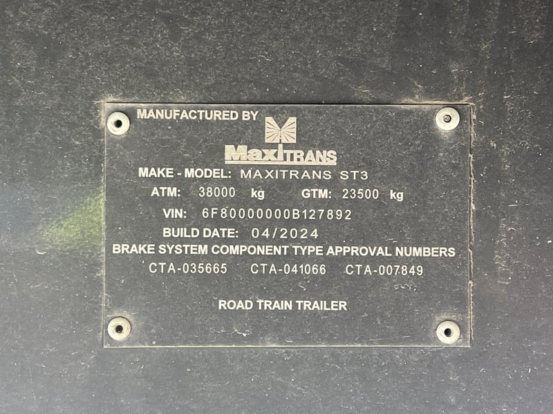 2024 Maxitrans ST3 Flatbed A trailer Year: 2024 Make: Maxitrans Model: ST3 Body: Flatbed Configuration: Triaxle Suspension: Airbags Length: 10.4m or 33ft VIN: 6F80000000B127892 Description/Extras: Undercarriage storage lock box, undercarriage storage cage, Right Weigh load scales, manual legs. Jost turntable GTM: 23500kg ATM: 38000kg