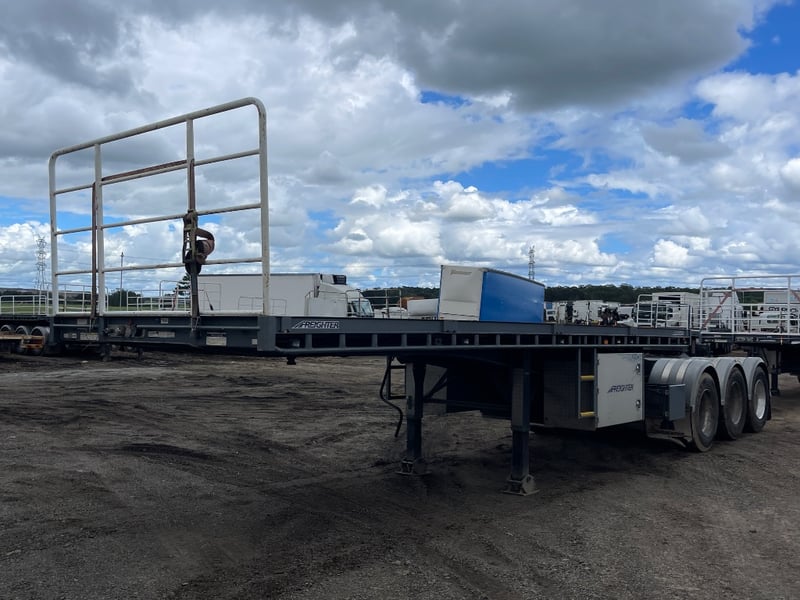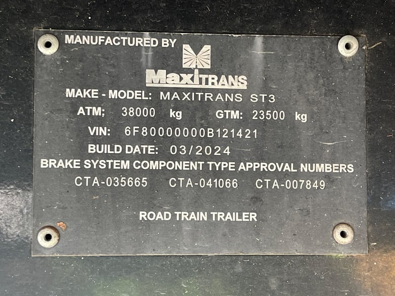2024 Maxitrans ST3 Flatbed A trailer Year: 2024 Make: Maxitrans Model: ST3 Body: Flatbed Configuration: Triaxle Suspension: Airbags VIN: 6F80000000B121421 Length: 10.4m or 33ft Description/Extras: 2x undercarriage storage lock boxes, Undercarriage storage cage, Right Weigh Load scales, manual legs. Jost turntable GTM: 23500kgs ATM: 38000kgs