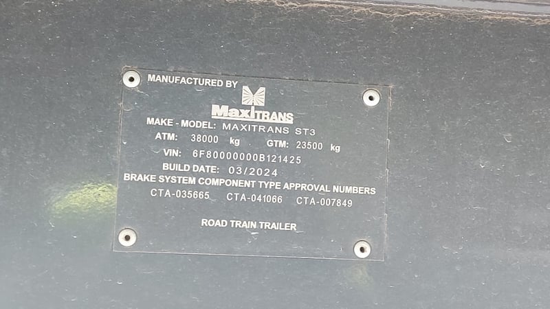 2024 Maxitrans ST3 Flatbed B Trailer with Tow Coupling Year: 2024 Make: Maxitrans Model: ST3 Body: Flatbed Configuration: Triaxle Suspension: Airbags VIN: 6F80000000B121425 Description/Extras: 3x undercarriage storage lock boxes, undercarriage storage cage, Right Weigh load scales, manual legs. Jost Rockinger tow coupling. GTM: 23500kg ATM: 38000kg Dimensions: 1340cm L x 250cm W x 280cm H (from ground to headboard)